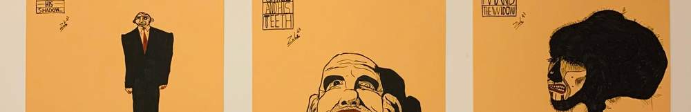 Diese Gemälde und die Charaktere darin sind meine einzigen Werke, denen ich einen gesellschaftlichen Kommentar zugebe. Im Großen und Ganzen halte ich „soziale“ Gemälde für ziemlich langweilig, doch wie Guston oder sogar die groteskeren Goya-Comics zuvor stellen sie eine spielerische Verhöhnung der Absurdität des unzerstörbaren Wunsches der Menschheit dar, ihre Tragödien zu wiederholen. Der komödiantische Charakter dieser Gemälde beruht auf ihrem Humor. Sie sind sich ihrer Abscheulichkeit bewusst, obwohl das nicht mein Bemühen war, sie sind einfach so entstanden und ich habe so wenig wie möglich mit Filtern gemalt.