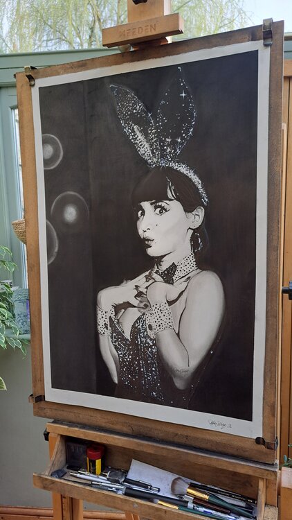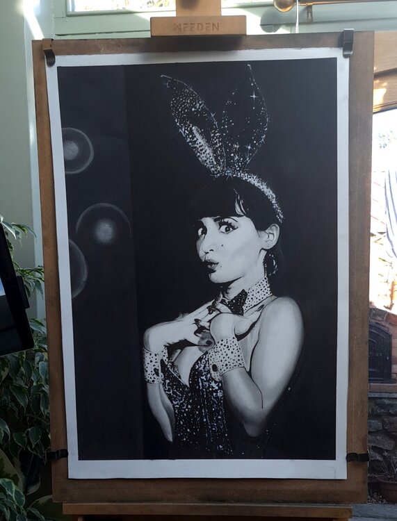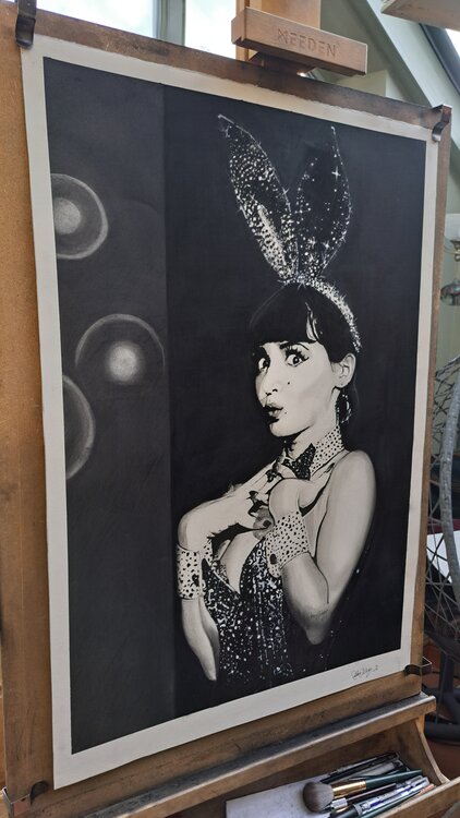 Porträt einer französischen Burlesque-Tänzerin, die im The Windmill in Soho, London, getanzt hat. Tänze auf der ganzen Welt. Große Fangemeinde in den sozialen Medien. Wunderschöne Tänzerin und Bild, das ich zeichnen durfte. Auch dieses Mal ist Bühnenbeleuchtung etwas, das ich liebe. Starke Schwarz- und Weißtöne. Graphitstifte, Faber-Castell Pitt schwarze Bleistifte und Graphitstifte. Weiße Farbe. Fabriano-Papier.