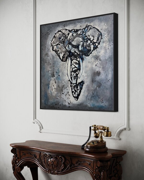 Dieses Werk verkörpert die großartige Majestät und Anmut eines Elefanten. Jedes Merkmal fängt die spirituelle und physische Essenz dieses majestätischen Tieres ein. Dieses Gemälde ist ein Erlebnis, eine Reise in die wilde Welt, in der die Natur die Oberhand hat.