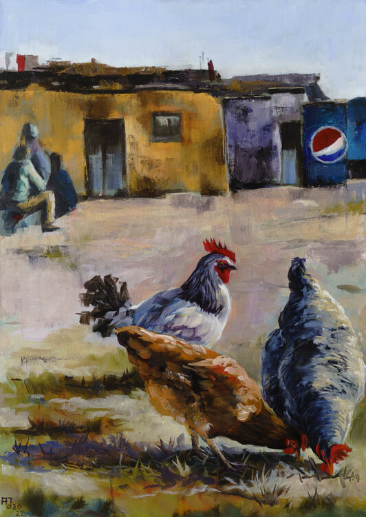 Drei Hühner picken Grashalme. Die Szene spielt sich in einen Slum Viertel ab. Im Hintergrund sitzen Männer zusammen bei den heruntergekommenen Häusern. Auf einer Wand prangt das Logo von Pepsi.