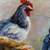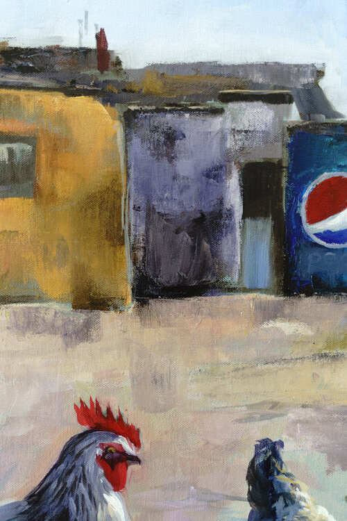 Drei Hühner picken Grashalme. Die Szene spielt sich in einen Slum Viertel ab. Im Hintergrund sitzen Männer zusammen bei den heruntergekommenen Häusern. Auf einer Wand prangt das Logo von Pepsi.