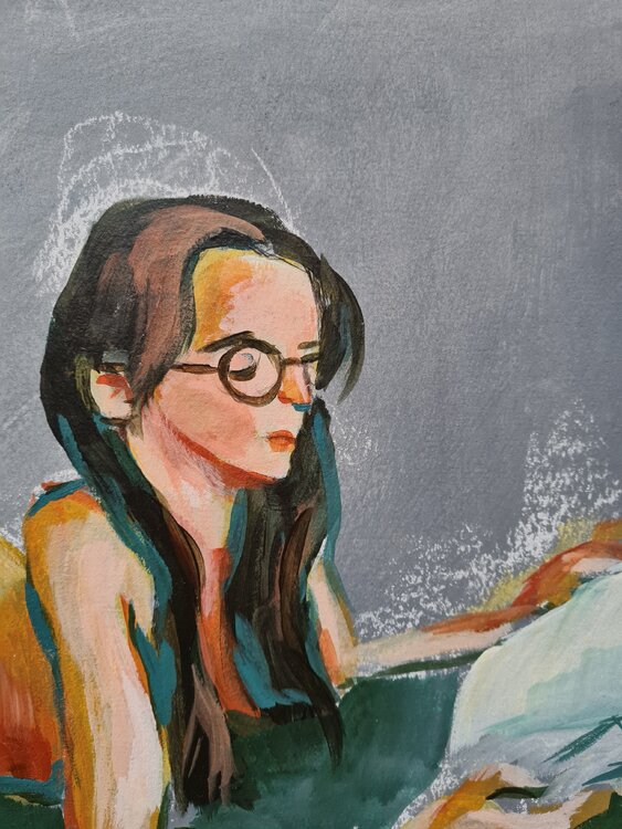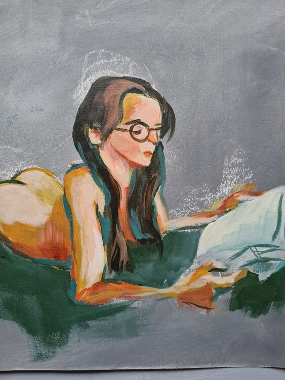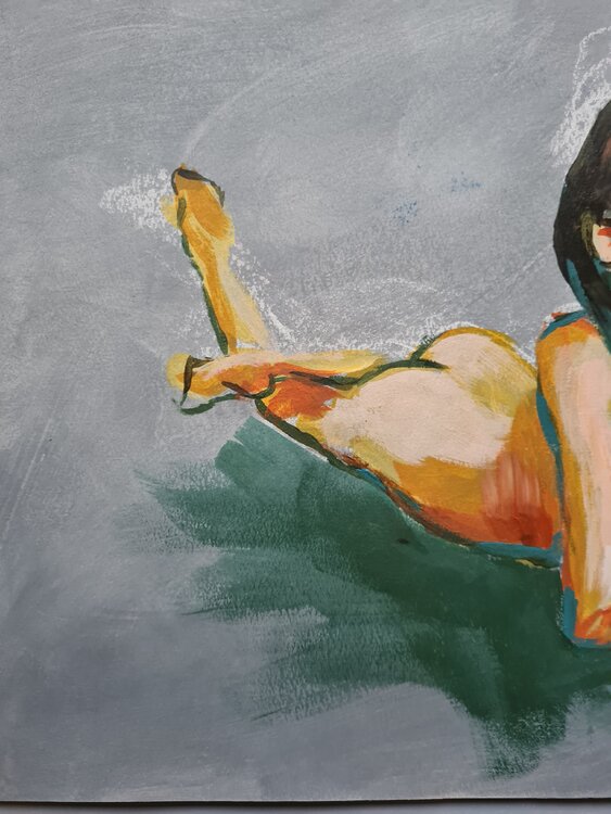 Goauche auf Papier. Das Papier ist mit Acryl grundiert. Gemalt in einer Online Life Drawing Sitzung mit 60 Minuten.