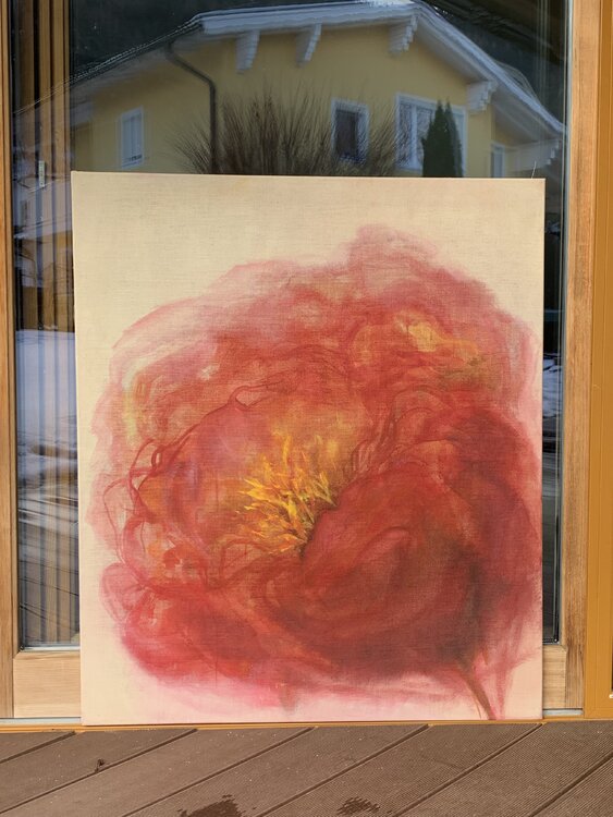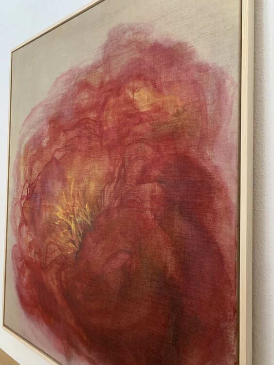 Von die Künstlerin gespannte italienische Leinen auf die Keilrahmen. Gemalen mit hoch pigmente Wasserfarben „water drops“. Diese Natur- nahe Farben von Leinenstoff, Natur Holzrahmen und die sanfte Rot wirken beruhigend und können gut in ein minimalistisch Interior sehr gut wirken.
