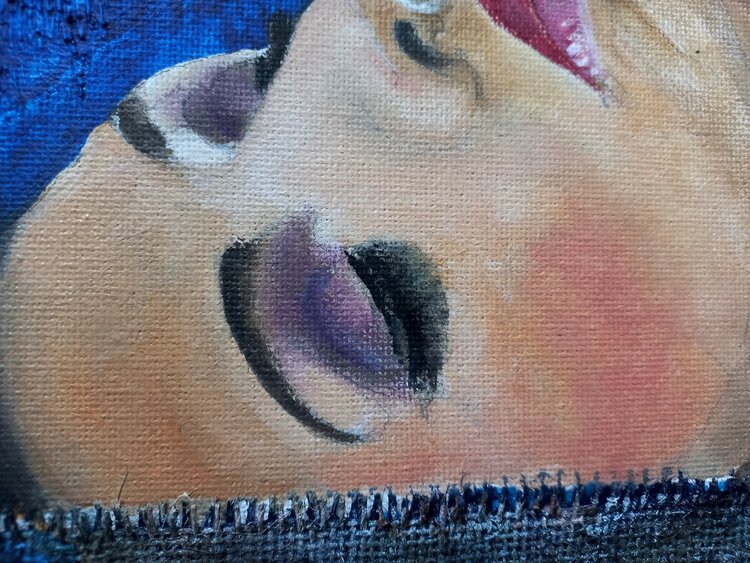 Das Portrait wurde mit Kohle vorgezeichnet, mit Acryl lasierend untermalt und mit mehreren Ölfarb-Schichten ausgeführt.
