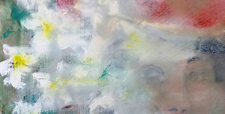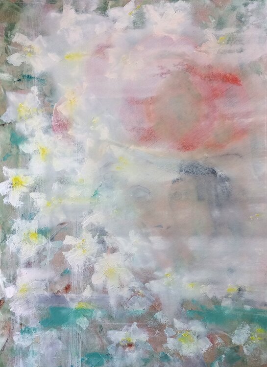 In diesem Bild sind beide Motive kombiniert und mit einem Squeegee (Gummiabzieher) gerakelt, so dass sich ein mysthisches abstrakt-realistisches Bild ergibt.