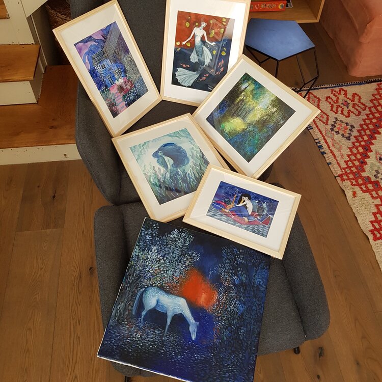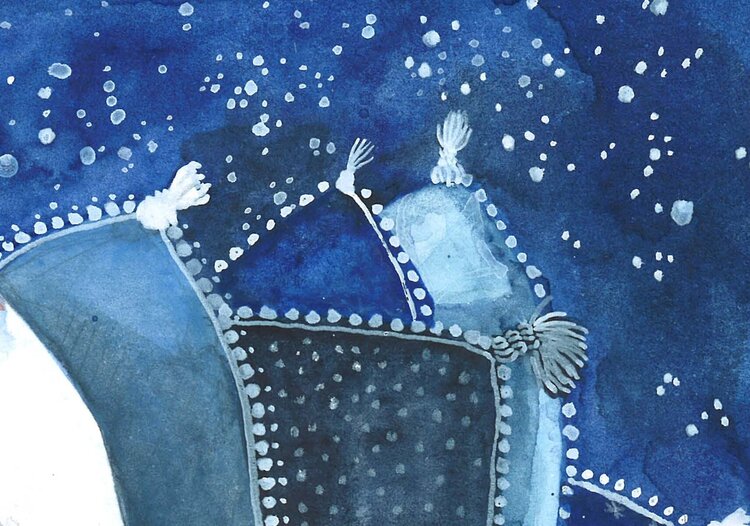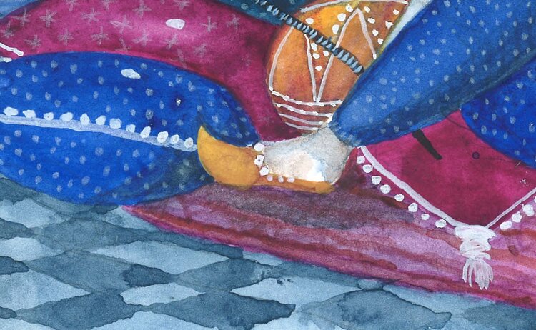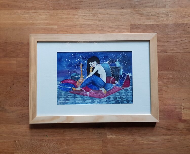 „Blaue Nächte“ ist eine Illustration, die Scheherazade darstellt, die Geschichtenerzählerin aus dem Buch „Tausend und eine Nacht“. Das Gemälde wird in mehreren Schichten Aquarell und Bleistift gemalt, was eine sehr dicke Textur ergibt.