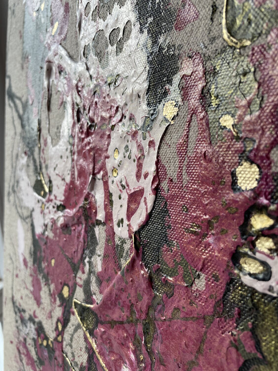Der sichtbare Leinenstoff wurde bewußt als gestalterisches Element eingesetzt. Durch den Kontrast zwischen dem derben Leinenstoff, dem eleganten Weinrot und der zarten Vergoldung wirkt das Werk spannungsreich und trotzdem harmonisch.