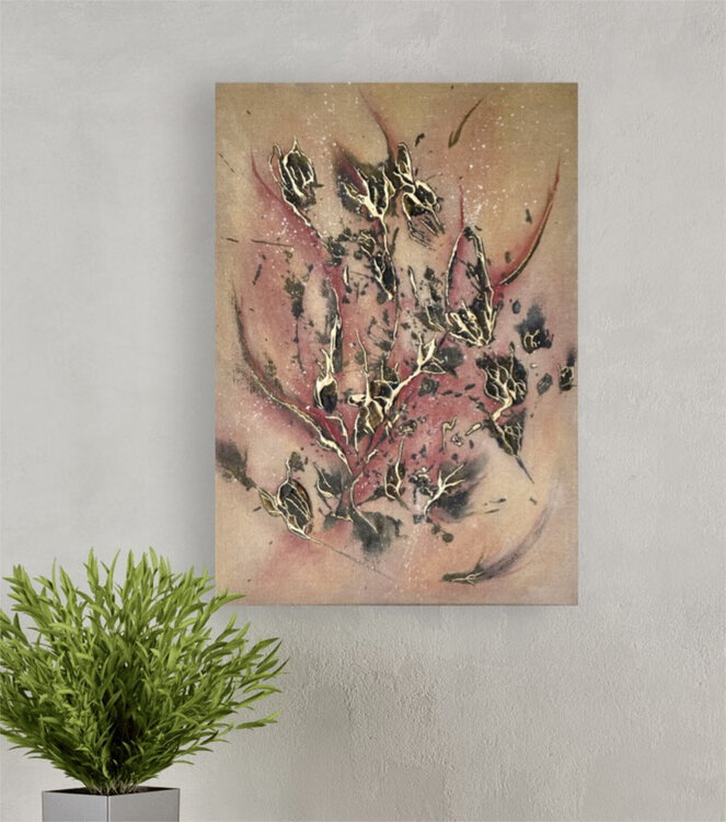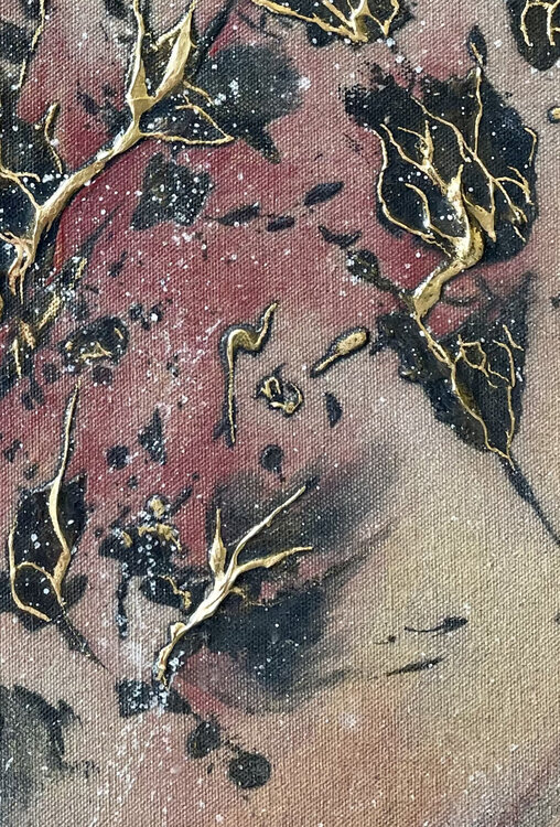 Der Untergrund ist zart golden schimmerndes Rohleinen mit schwarzer Strukturpaste, die zum Teil aufwendig vergoldet wurde. Ein leicht rötlicher Schimmer im Hintergrund gibt ihm einen Hauch von Ewigkeit.