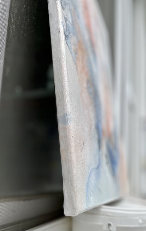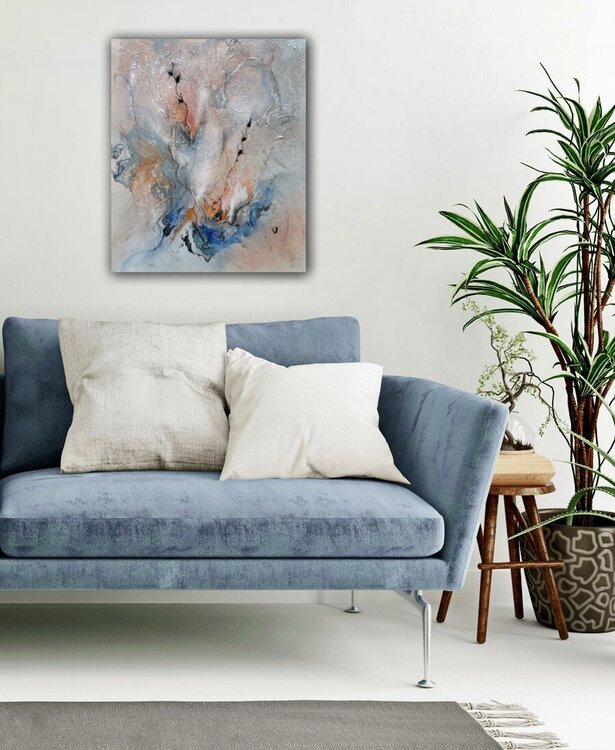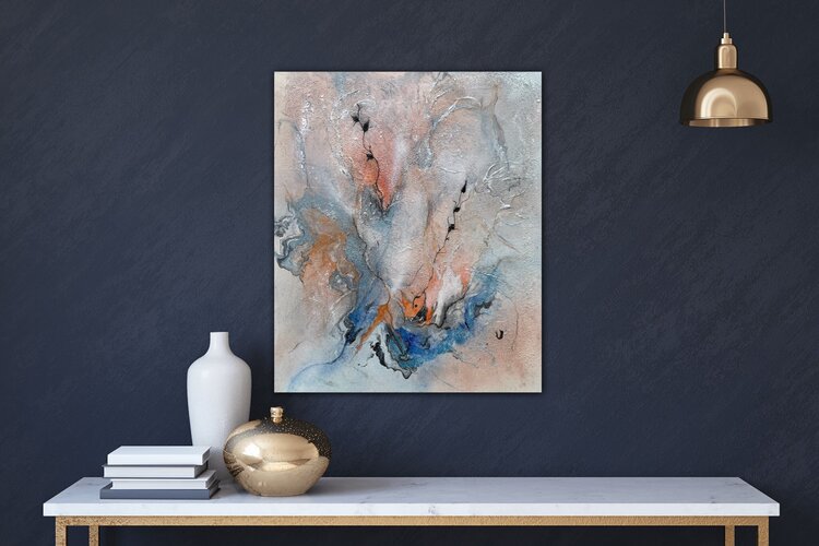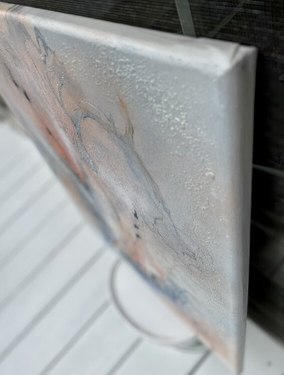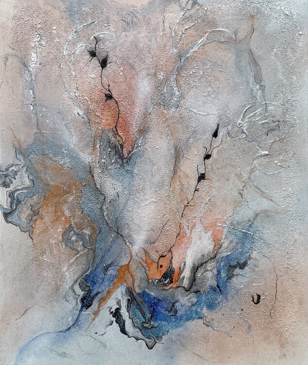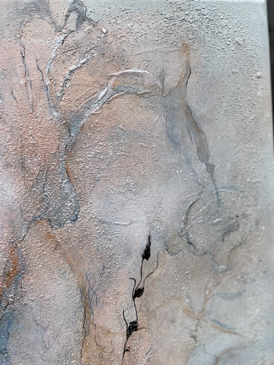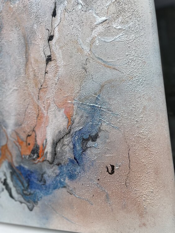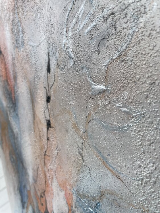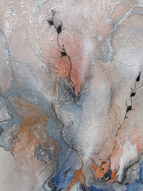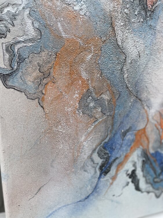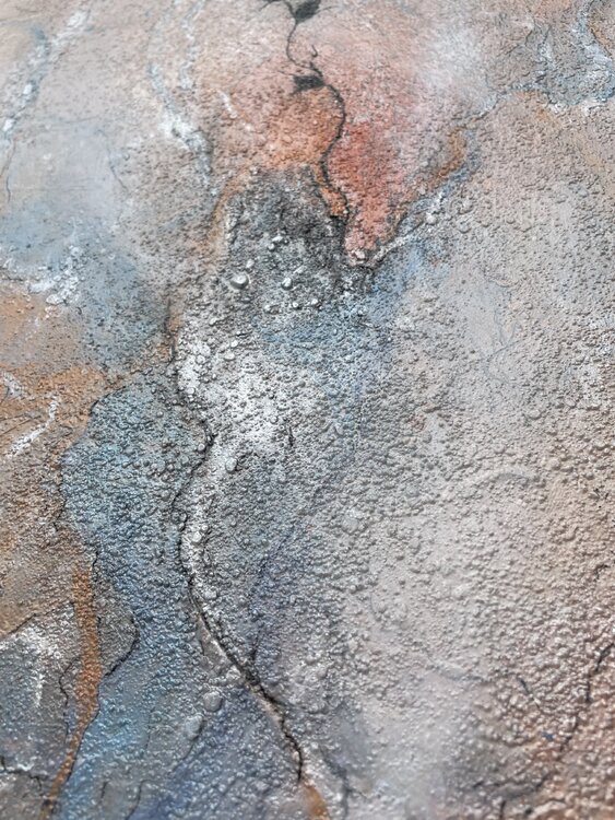 Bei der Erstellung wurden schimmernde Pigmente, Acrylfarbe, Farbspray, Marker und Marmormehl für die Struktur verwendet.