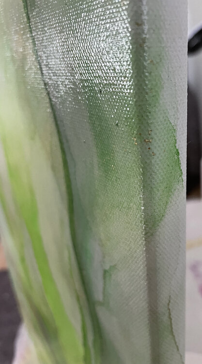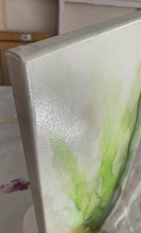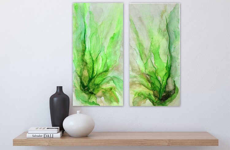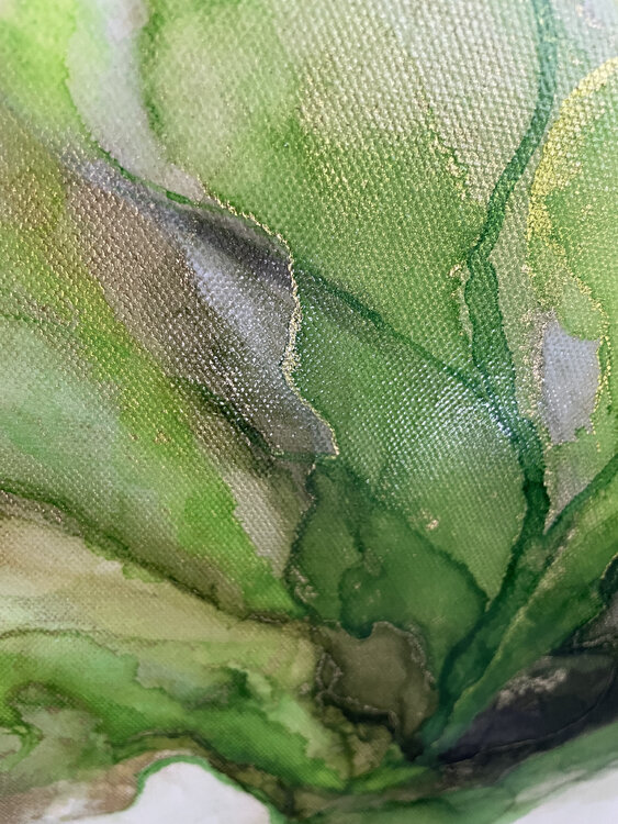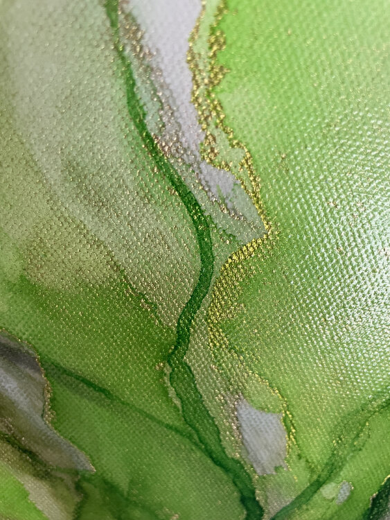 Leuchtendes saftiges Grün - Ursprung des Lebens, Farbe des Glücks. Dieses Werk fällt sofort durch seine Leuchtkraft auf. Feine Goldfäden durchziehen das Motiv. Es wurde ausschließlich mit Alkoholtinte gemalt. Die ursprüngliche Leinwandstruktur ist deutlich erkennbar.