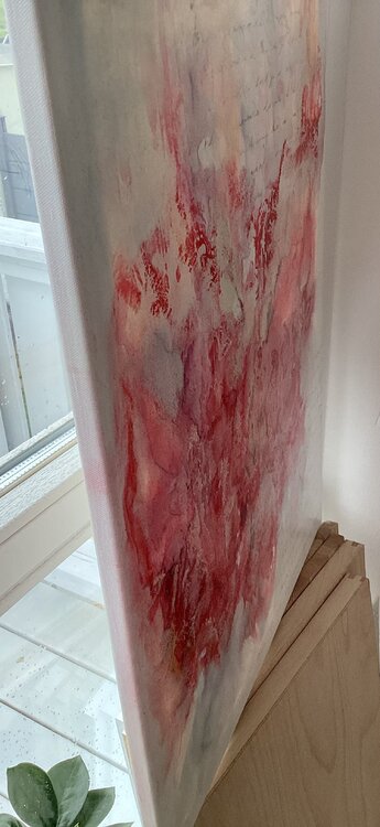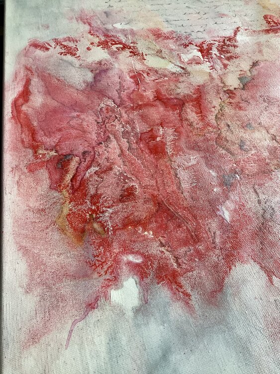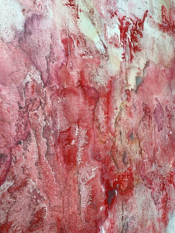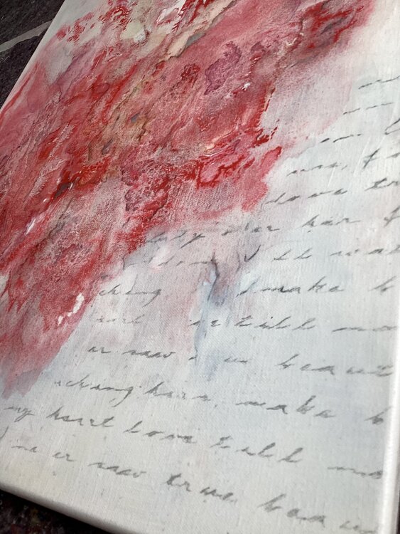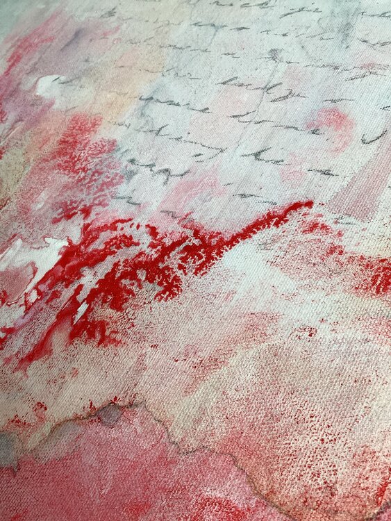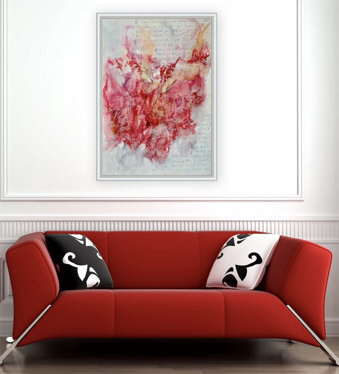 Ein Liebesbrief und ein vor Sehnsucht zerfließendes Herz. Leuchtend und vibrierend. Mixed Media Technik aus Acryl-, Aquarellfarben und Graphit auf Leinwand. Die Kombination aus Acryl und Aquarellfarben und die in mehreren Schichten lasierend aufgetragenen Farbschichten verleihen dem Werk Transparenz und gleichzeitig Leuchtkraft.