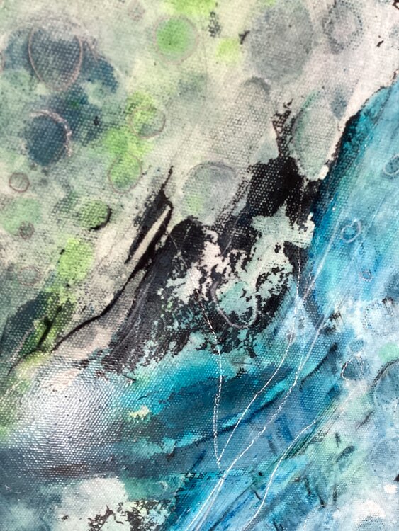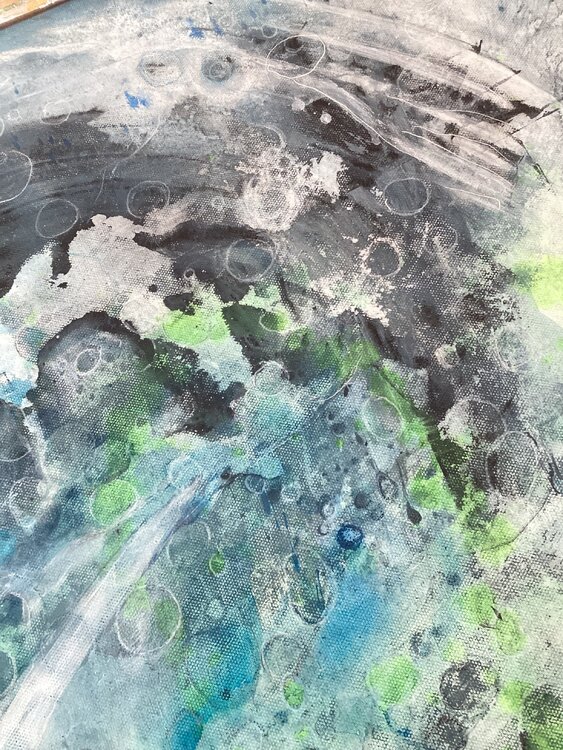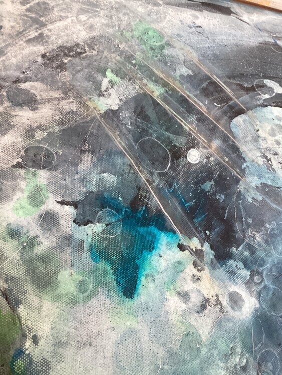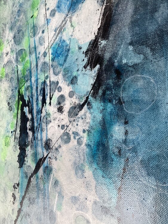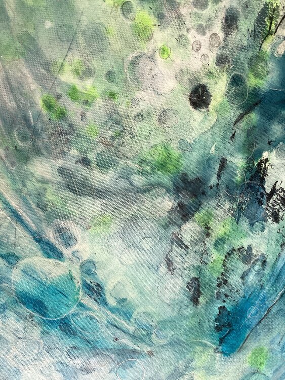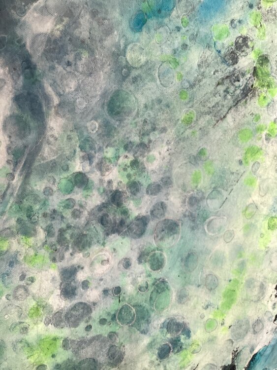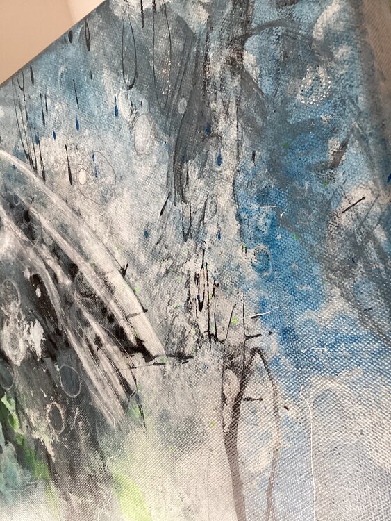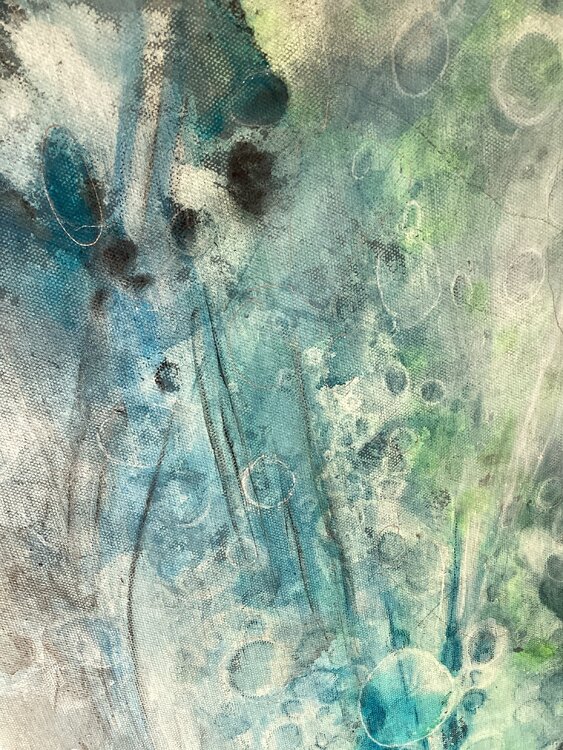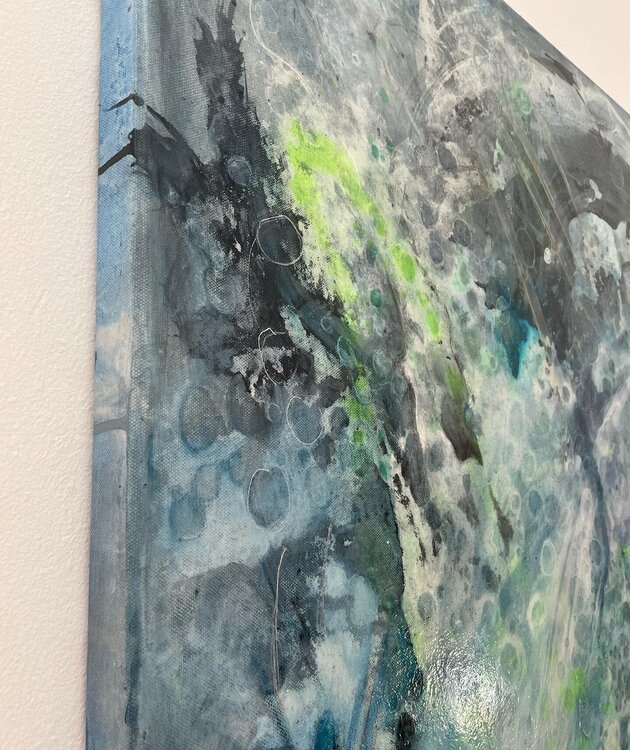 Das Werk wurde in mehreren Schichten mit Künstleracrylfarben , reinen Künstlerpigmenten, Alkoholtinte und Kohle aufgebaut. Die gesturale Maltechnik, die einzeln ausgearbeiteten Luftblasen und die leuchtenden leicht1