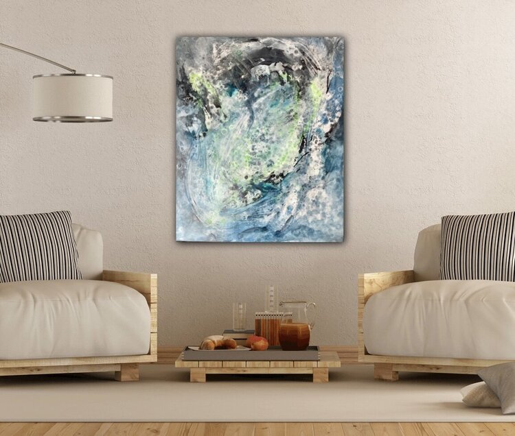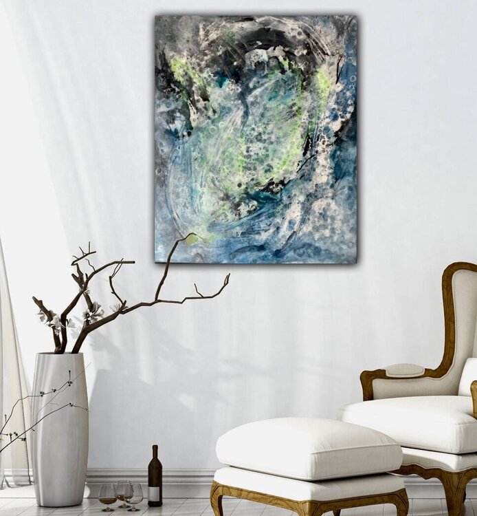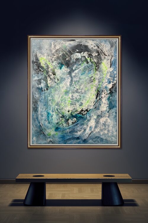 Mit diesem Kunstwerk möchte die Künstlerin die Kraft des Wassers und den Moment des Auftauchens aus der Stille des Meeres an das, durch die Oberfläche schimmernde Licht darstellen.