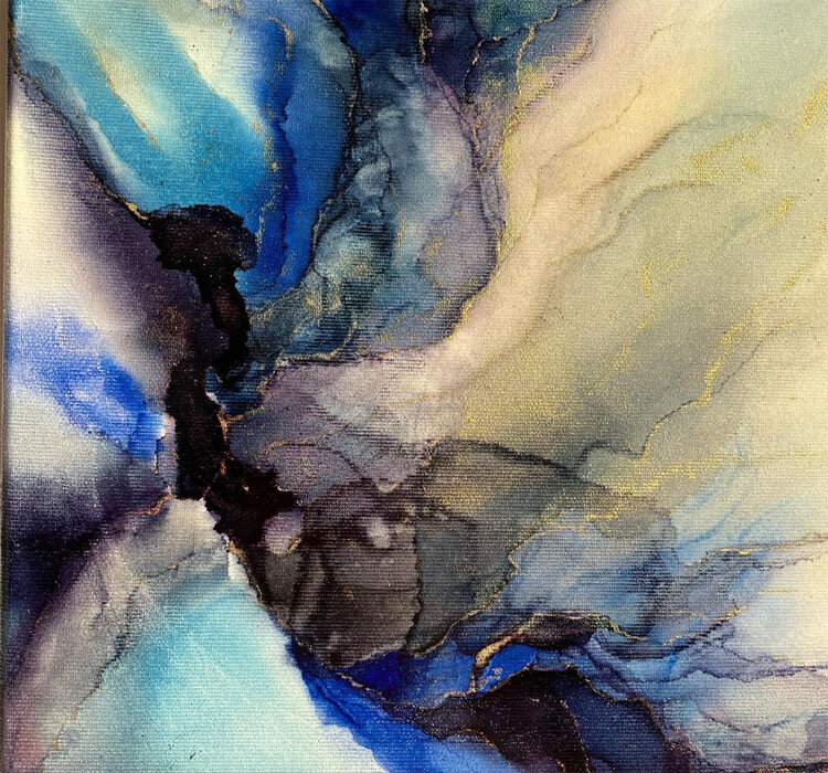 Die Farben changieren von dunklem schwarzviolett über grau und tiefem blau bis zu eine hellen leuchtendem blau und rosa apricot Tönen. Das ganze wird von feinen Goldlinien durchzogen.