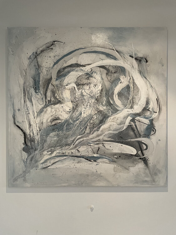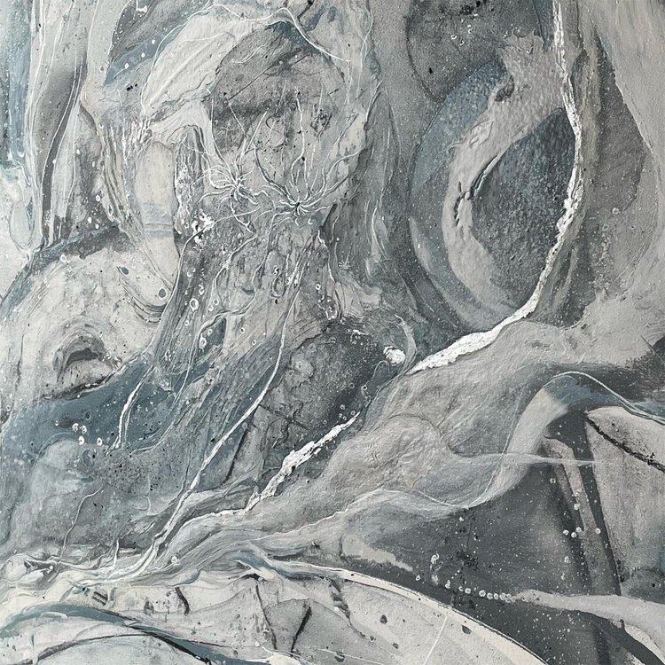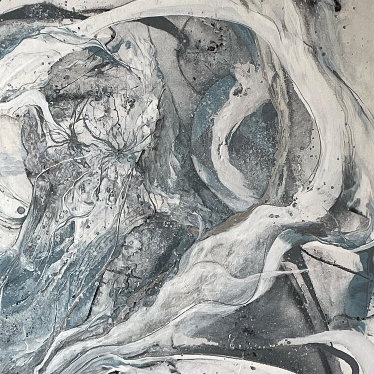 Eine Mischung verschiedener Techniken von gezeichnet mit Kohle, gegossene Acrylfarbe, aufgebrachtes Blattsilber und feinste silberne Markerzeichnungen.