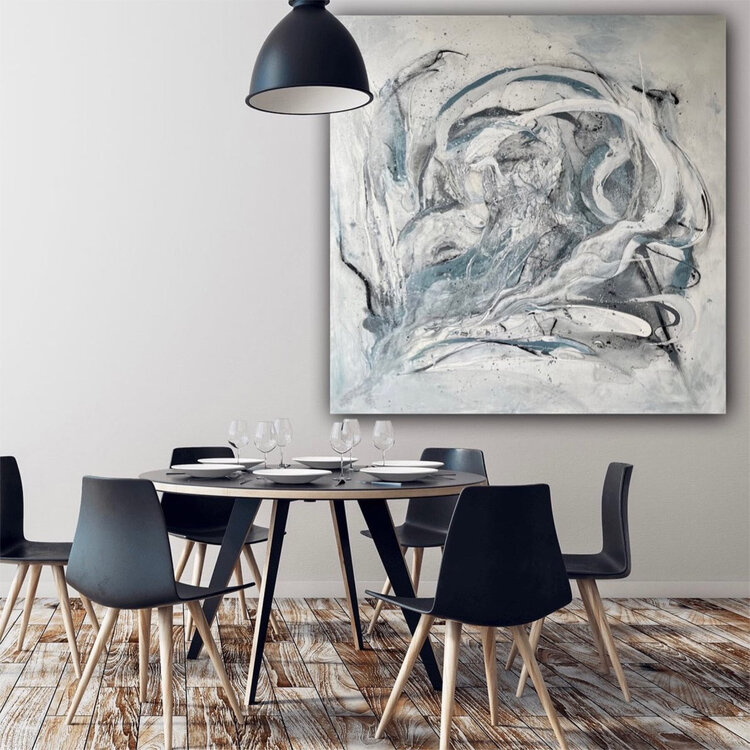 Dieses Werk lädt ein Details zu entdecken. Es kann sofort aufgehängt werden. Die Seiten sind vollkommen bemalt. Mit eine dünnen weißen oder silbernen Schattenfugenrahmen sähe es aber auch hervorragend aus.