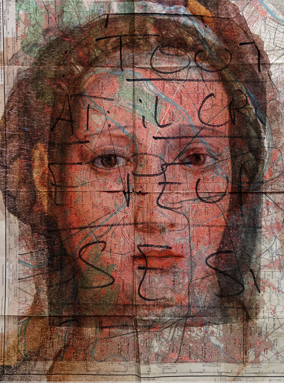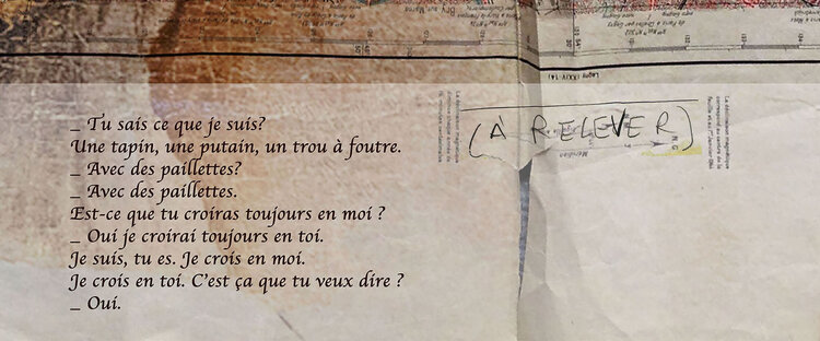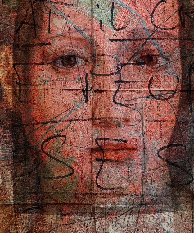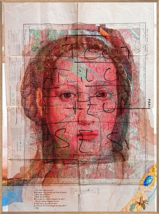 Dieser Druck ist eine Mischung aus vielen verschiedenen Trägern: Eine alte gescannte Karte von Paris, eines der alten Gemälde des Künstlers, ein von Botticelli gemaltes Porträt einer Frau (Eva hegt große Bewunderung für die Maler der italienischen Renaissance), Fragmente antiker Symbole die der Künstler geschaffen hatte, sowie einen Text, der für eine Installation geschrieben wurde, die für die Duoshow „Bondieeries“ in der Pariser Galerie Graphem1