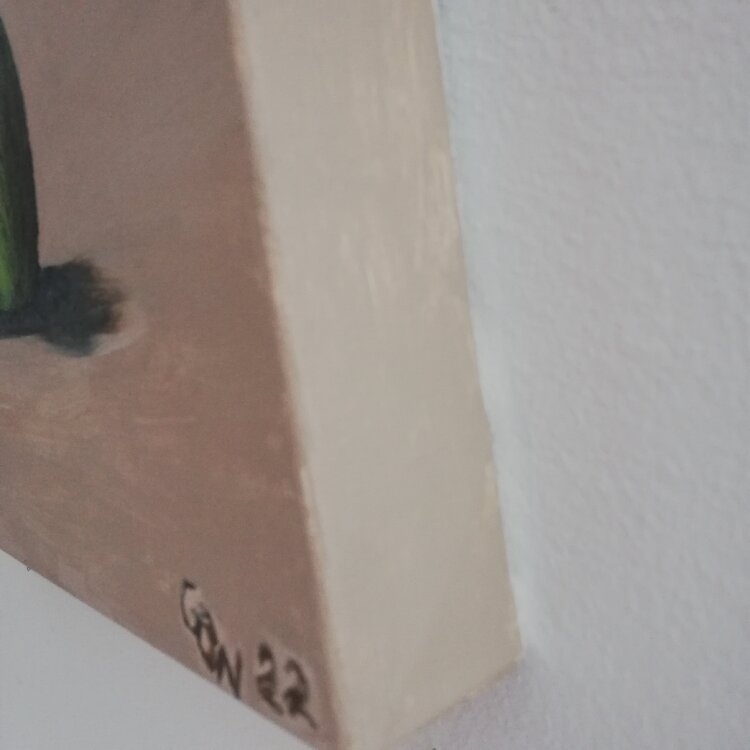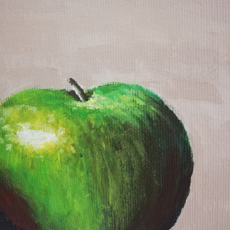 Das Werk ist ein Stillleben von 2 Granny Smith Äpfeln, die nebeneinander liegen. Ich bin begeistert von dem intensiven Grün der Äpfel, die sich so total von dem Hintergrund abheben. Ich habe Acrylfarben benutzt auf einer hochwertigen, 4,5 cm starken Leinwand. So wirkt das Bild auch ohne Rahmen.