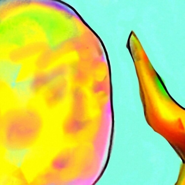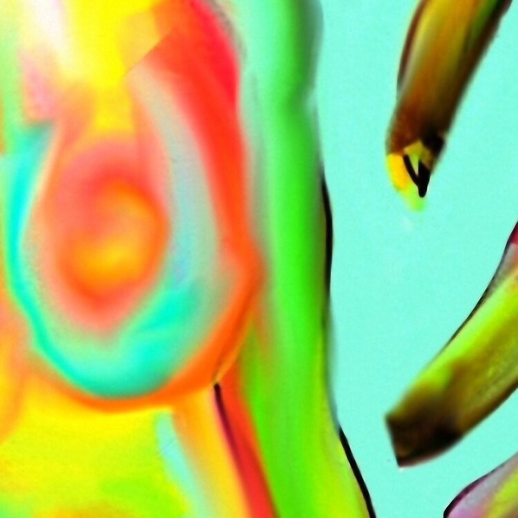 Lebendige Farben schaffen eine abstrakte Darstellung einer menschlichen Figur und organischer Formen, die an Zweige oder Korallen erinnern. Die Neontöne und weichen Kanten vermitteln eine traumhafte Qualität, während die Signatur unten rechts darauf hindeutet, dass das Werk von einem Künstler stammt, der durch die Initialen „H.S.“ identifiziert wird. aus dem Jahr 2024.