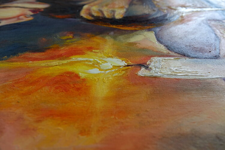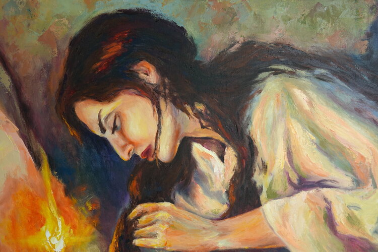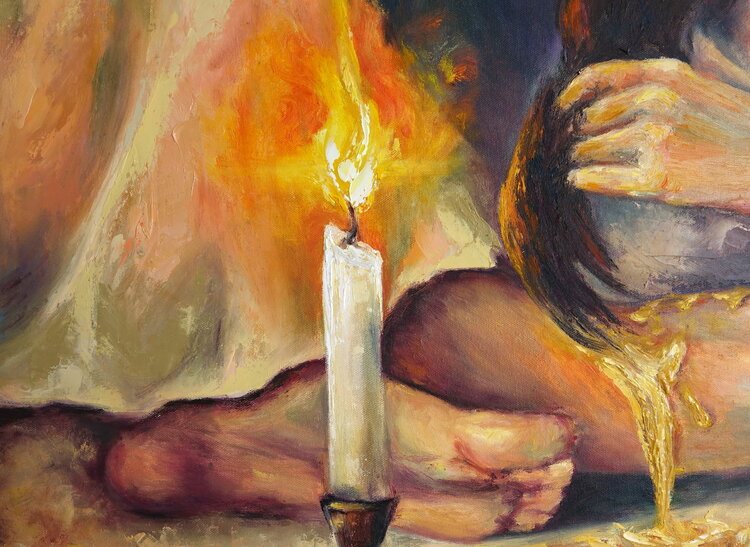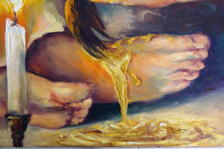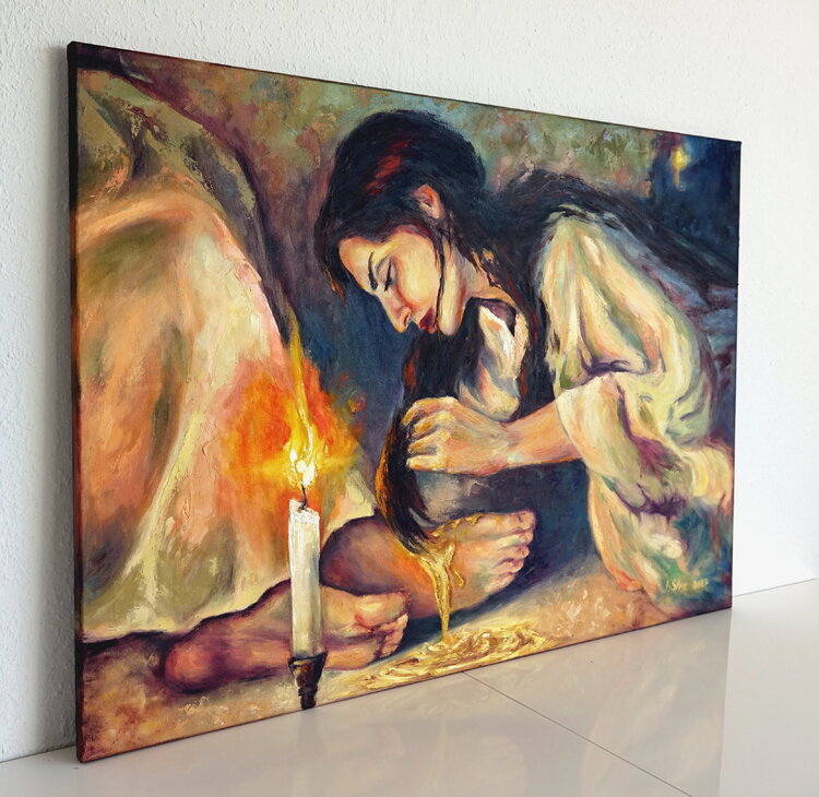 Dieses Gemälde beschreibt eine Szene aus der Bibel, in der eine Frau kam, um dem Erlöser der Welt ihre Dankbarkeit auszudrücken. Maria goss reine, kostbare Myrrhe, Myron (heiliges Salböl), auf die Füße Jesu Christi und wischte es mit ihren Haaren ab; und das Haus war erfüllt von Duft. Myrrhe ist ein sehr teures Öl – es wurde zu besonders feierlichen Anlässen verwendet. Mit Myrrhe wurden Könige und Priester gesalbt. Aber es kann keine übermäßige Großzügigkeit1