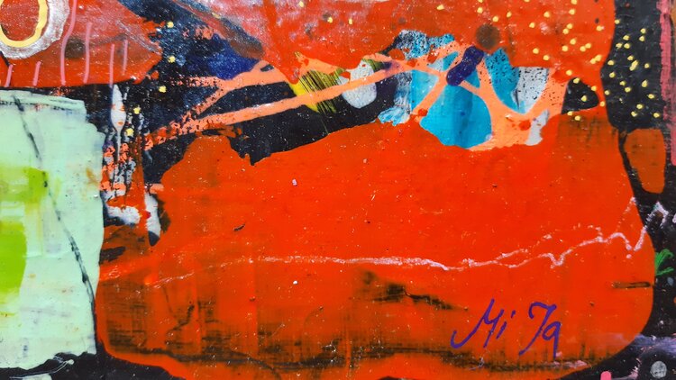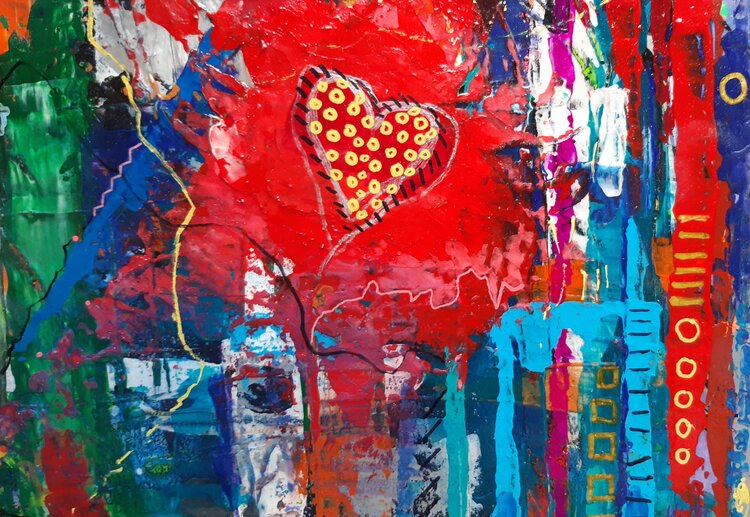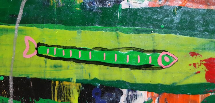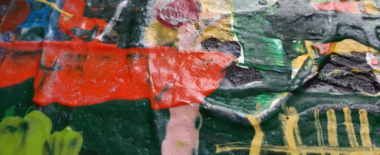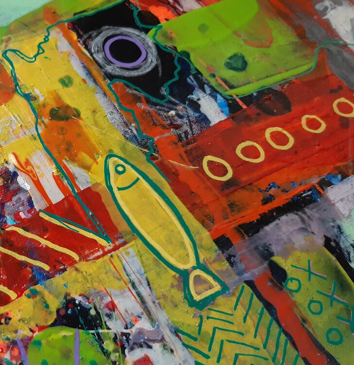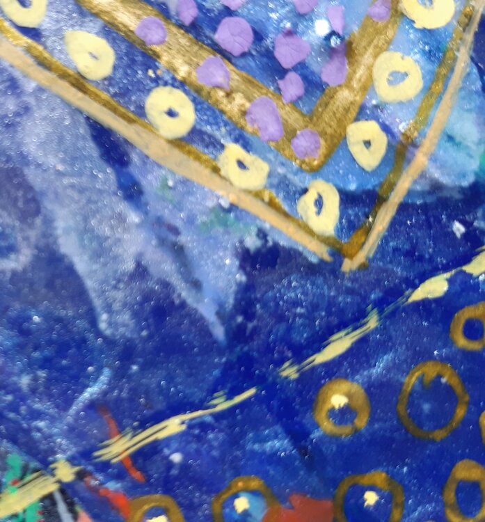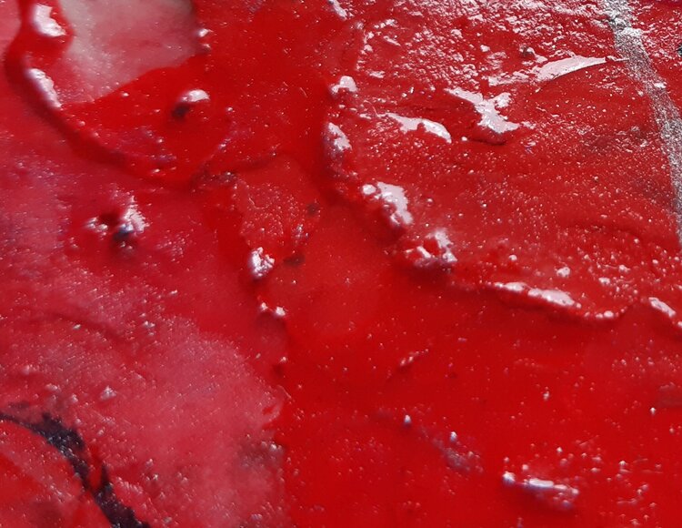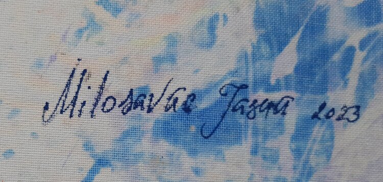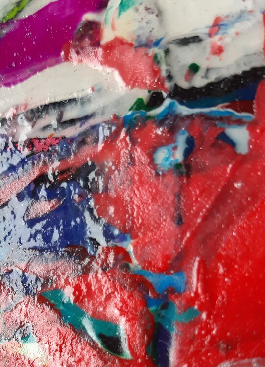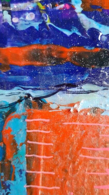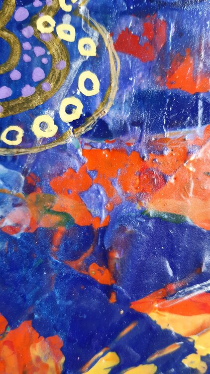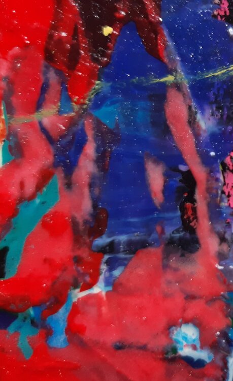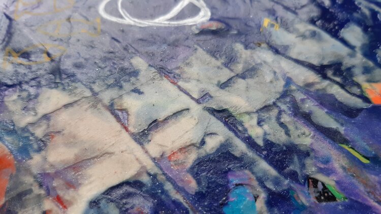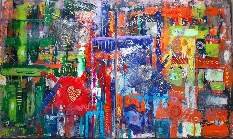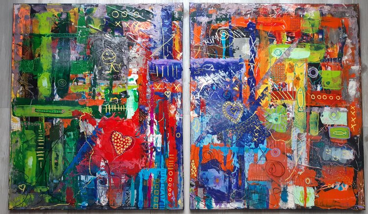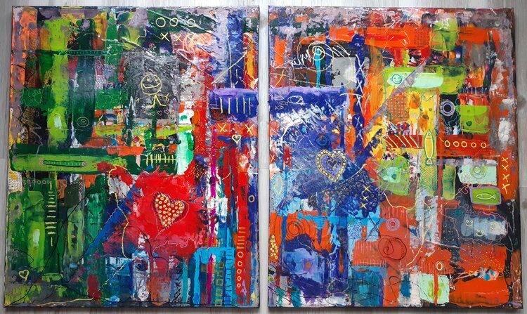 Das Bild wurde mit Acrylfarbe und Harz ( Oberfläche) auf den zwei gespannten Leinwänden ( 2x 50x60 cm) gemalt.