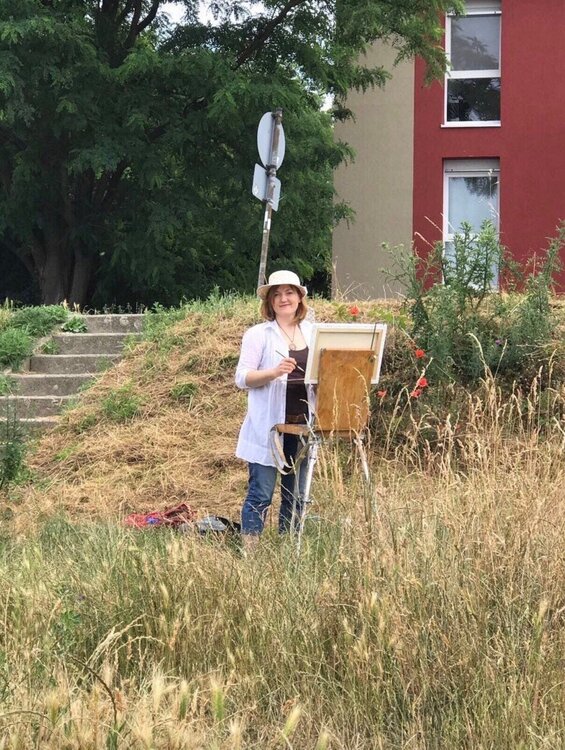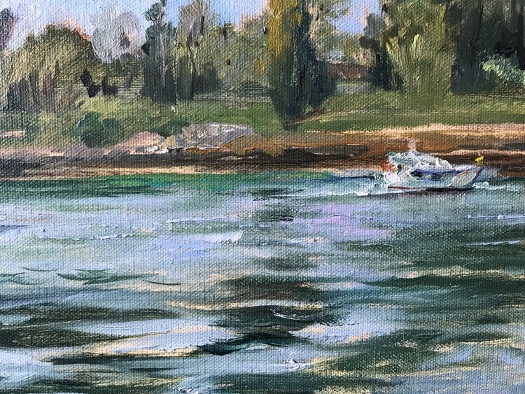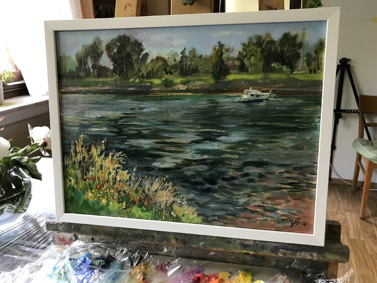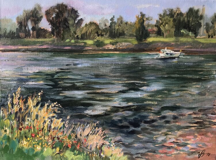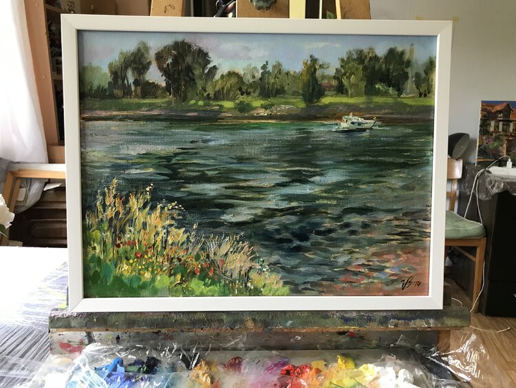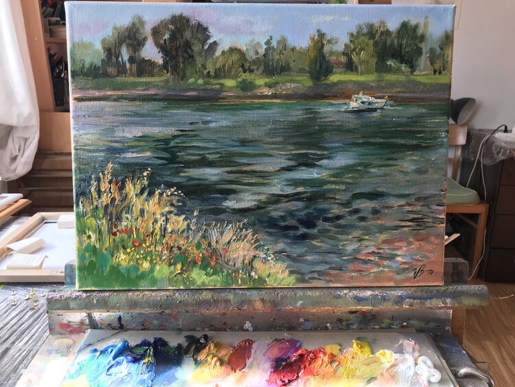 Ölgemälde der Blick auf den Rhein Fluss direkt von Natur abgemalt von Künstlerin Katharina Valeeva.