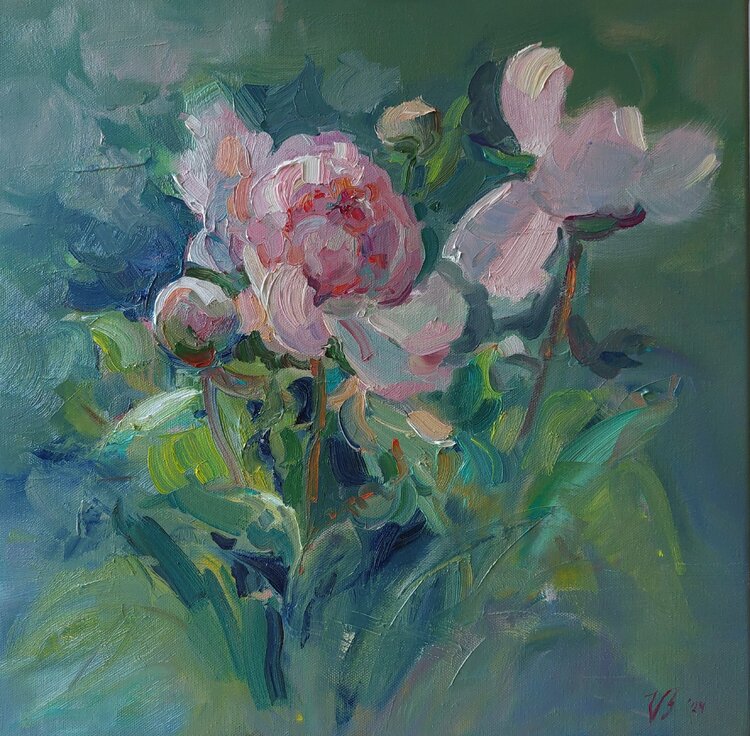 Nach dem Leben gemaltes Blumenstillleben im traditionellen Stil des klassischen Realismus.