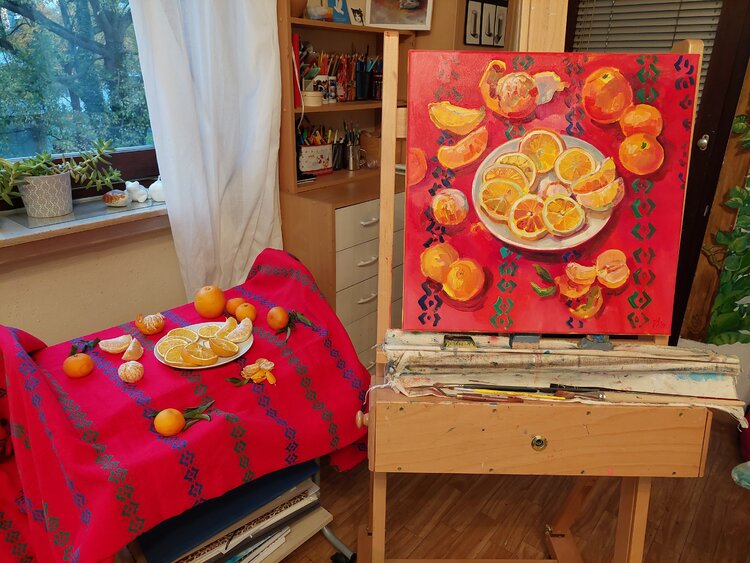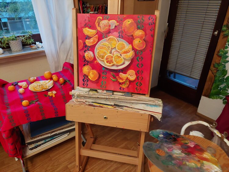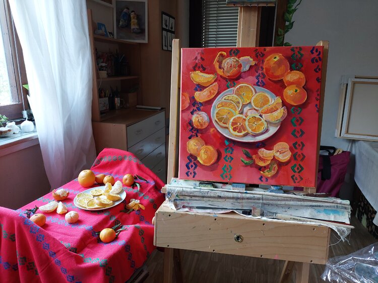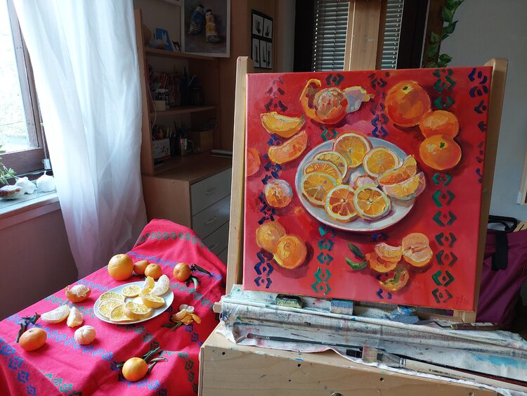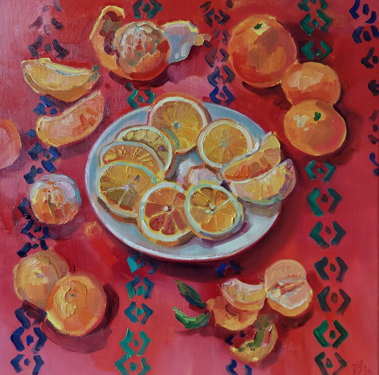 Ein saftiges Stillleben aus Orangen und Mandarinen auf einem rotem Hintergrund mit orientalischen Mustern.