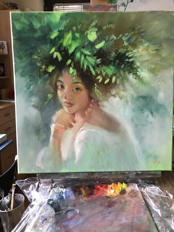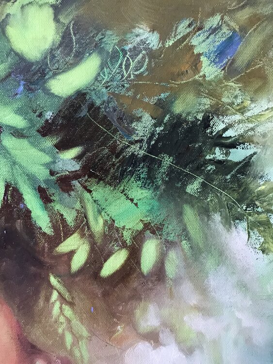 Ein Gemälde in sanften grünen Farben und Tönen.