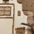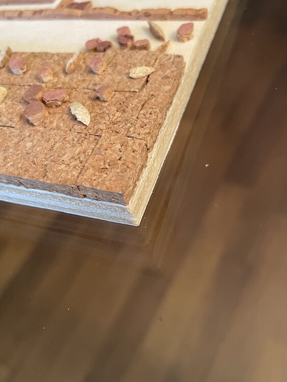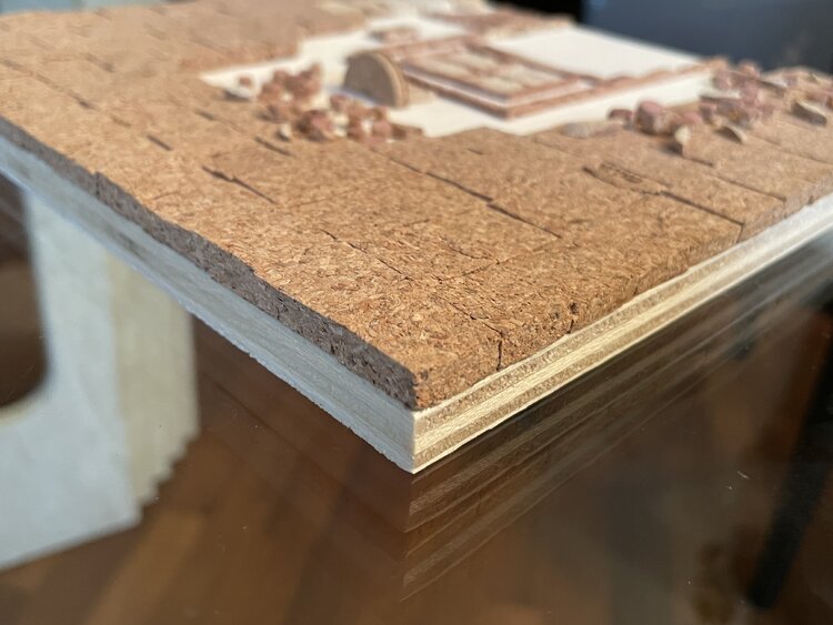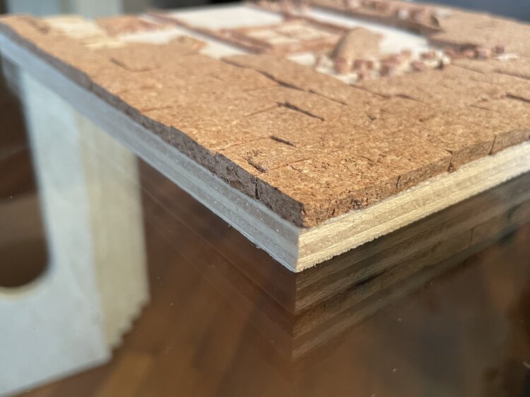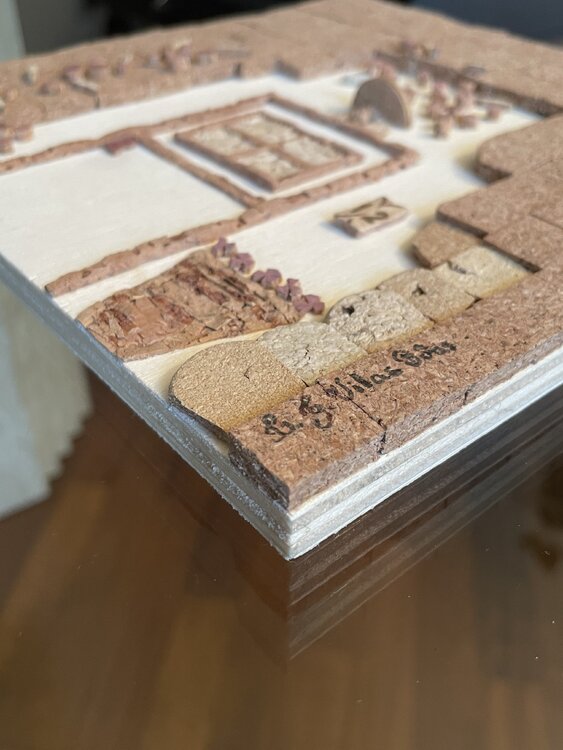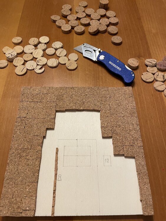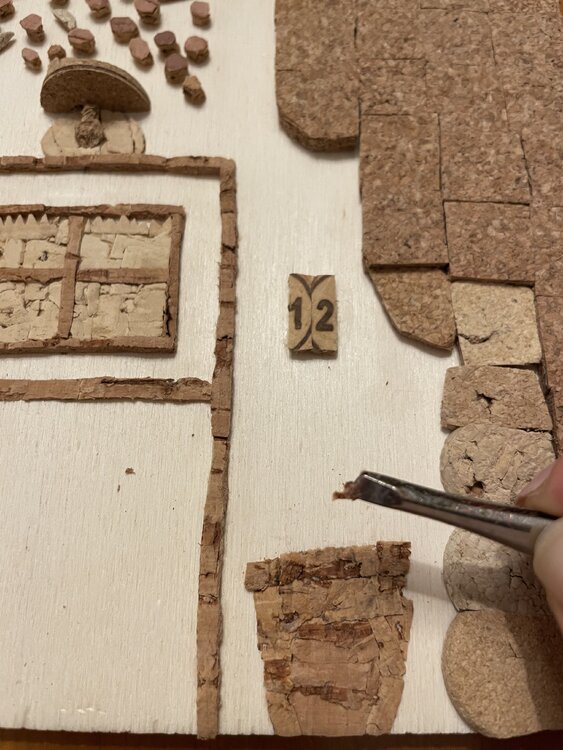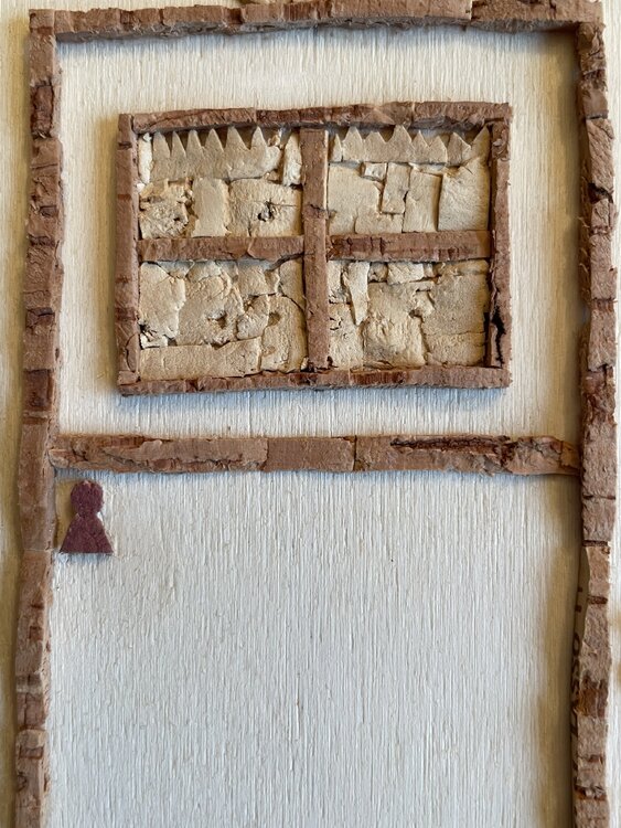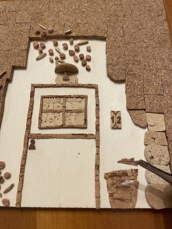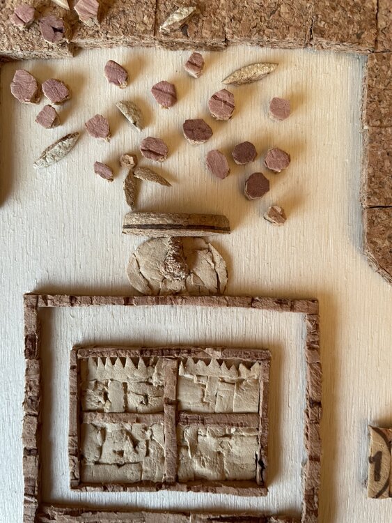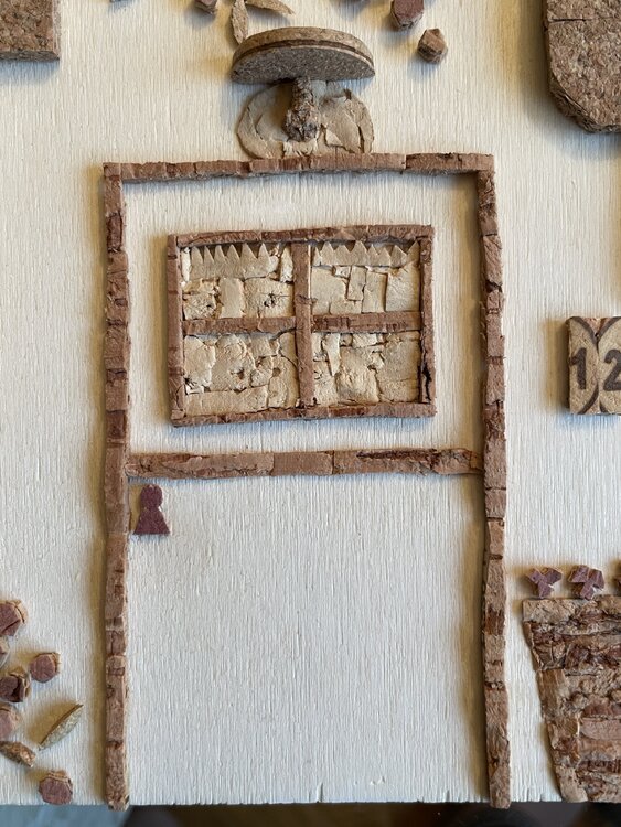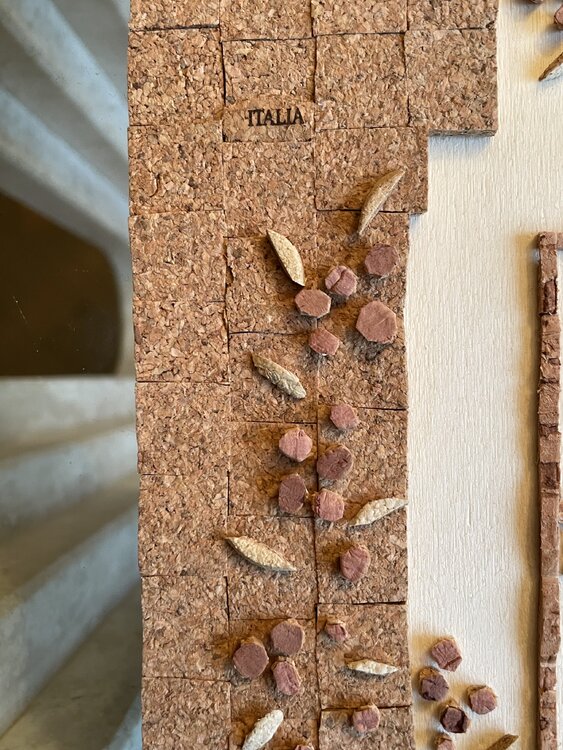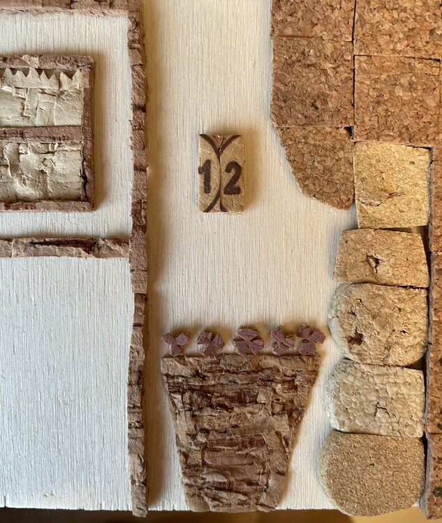 Tür eines alten Hauses mit der typisch italienischen Steinfassade, dargestellt durch den mit Korkquadraten bedeckten Teil, mit der traditionellen Terrakottavase am Eingang und den unvermeidlichen Blumen, die an den Wänden klettern. Die Mängel der Holzgrundplatte im unteren Teil wurden bewusst freigelegt, um das gealterte Erscheinungsbild der Tür sowie ihre Ungenauigkeiten hervorzuheben.