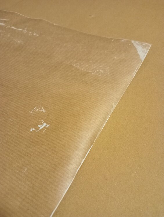 Papier, etwa einen Millimeter dick, fertig zum Aufhängen unter Glas oder Plexiglas.