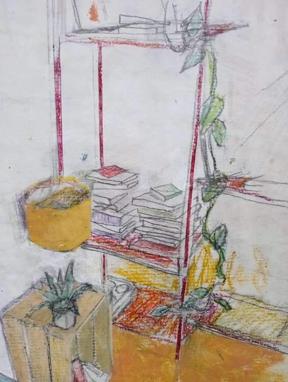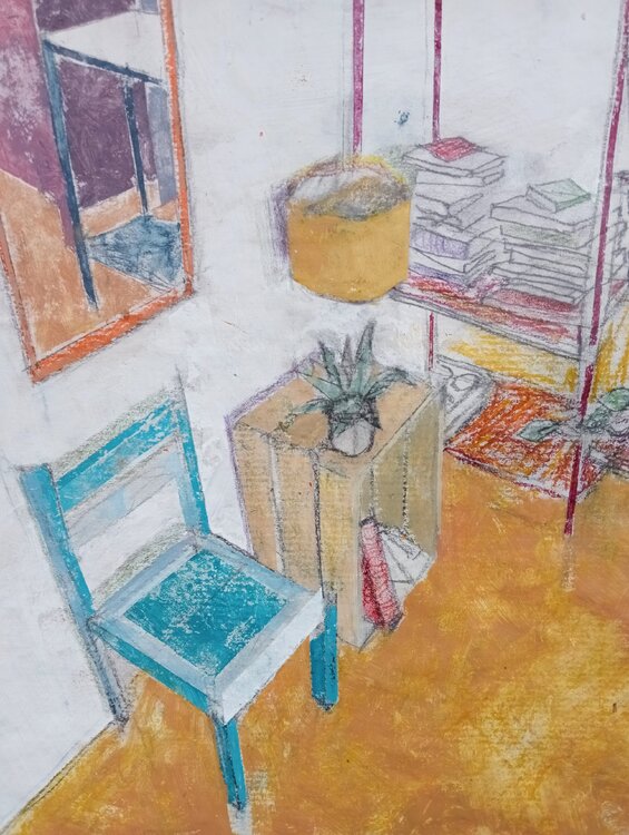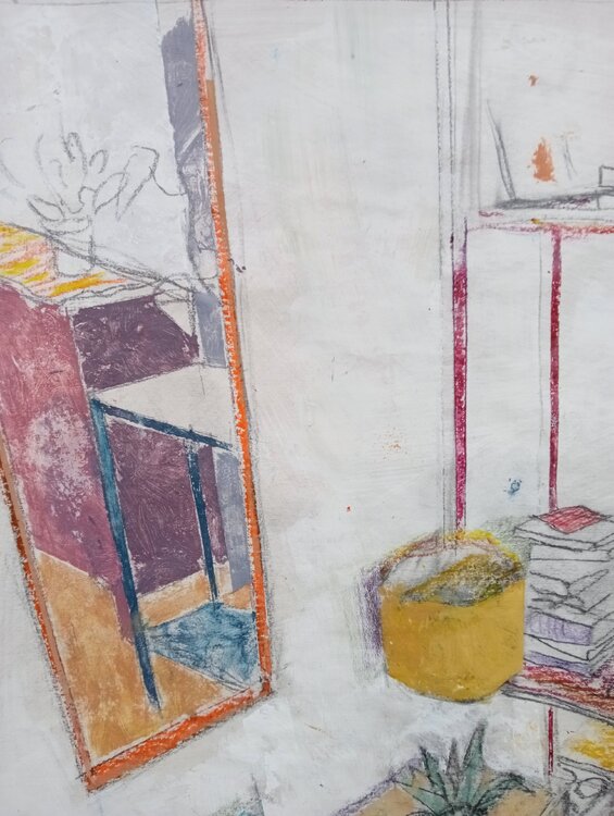 Das Gemälde ist in Mischtechnik (Acryl, Bleistift, Buntstifte, Kugelschreiber) gemalt.