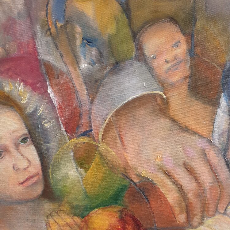 Es gibt Hände, die eine Berührung suggerieren, und auf den Gläsern und außerhalb davon sind Gesichter und Gesichtsskizzen in einem Spiel mit Realität und Erinnerung zu sehen.
