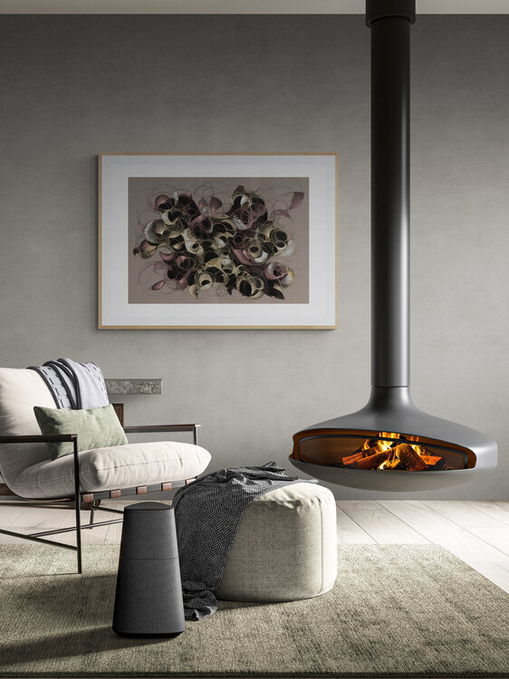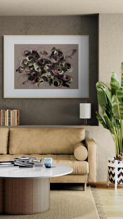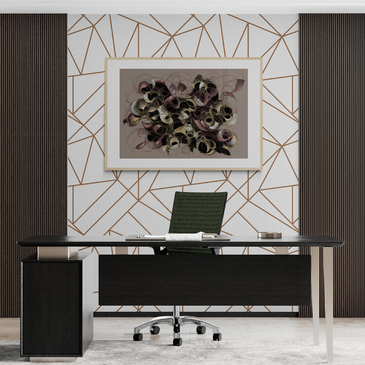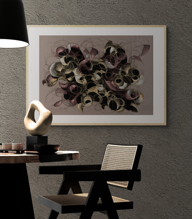 Geschwungene Formen verflechten sich und dehnen sich anmutig aus und scheinen im umgebenden Raum zu tanzen. Jede Kontur fließt mühelos und erzeugt ein Gefühl von Flüssigkeit und Bewegung, das den Blick des Betrachters einfängt. Das Zusammenspiel von Licht und Schatten betont die Dynamik der Komposition und projiziert komplexe Muster, die ein Gefühl von Tiefe und Dreidimensionalität hervorrufen.