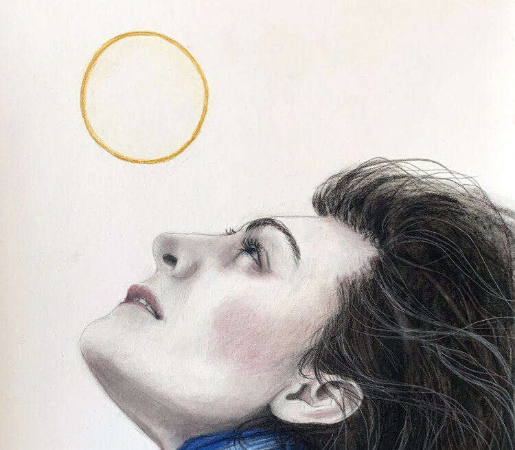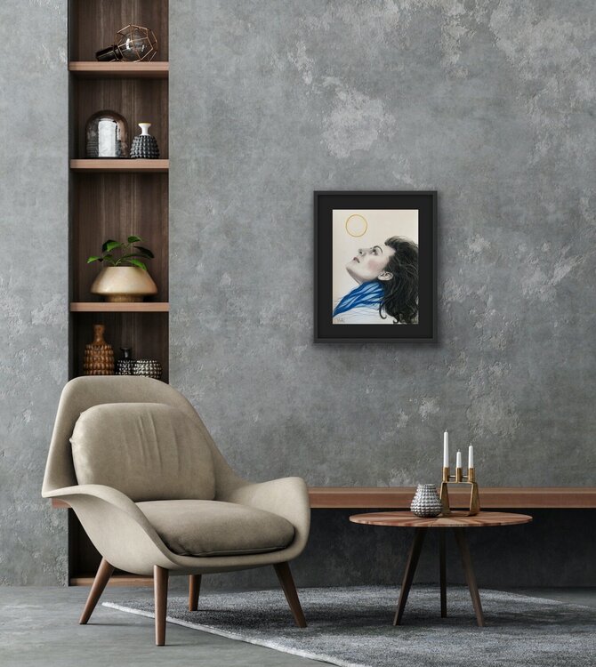 Das Werk „Meer“ entsteht auf Samtpapier Pastelmat, unter Verwendung von weichen Pastellkreiden und Carbothello-Pastellkreiden, das mit einer Schutzschicht aus Fixiermittel überzogen ist.