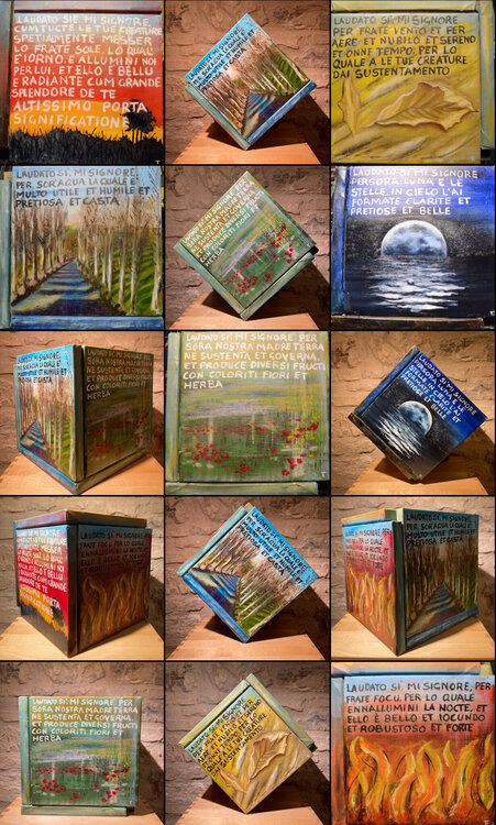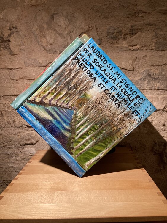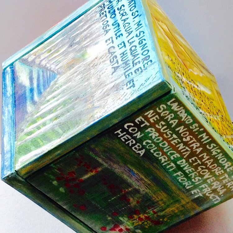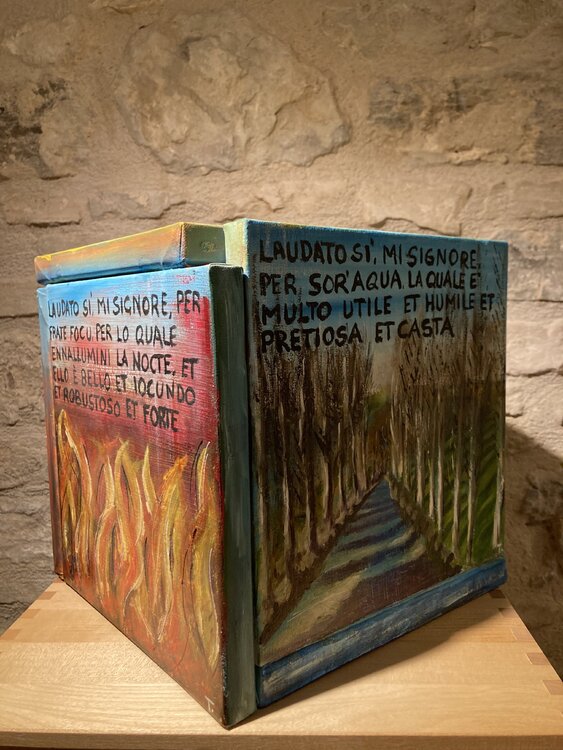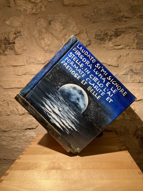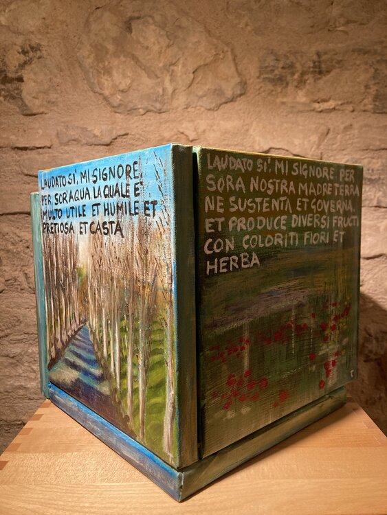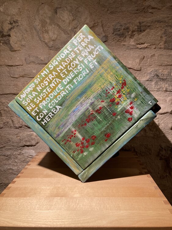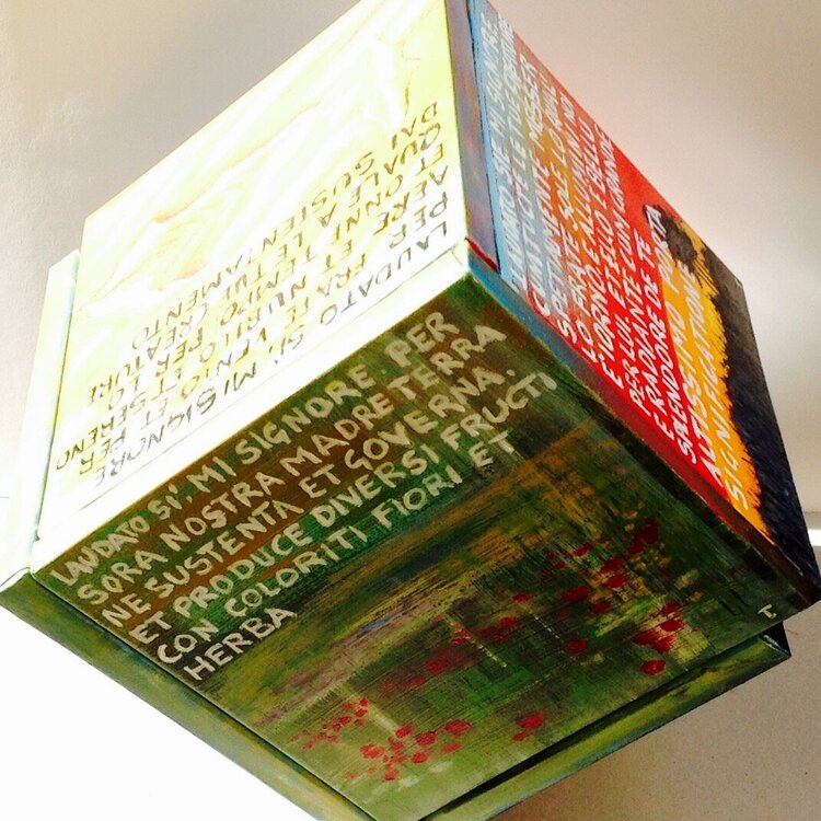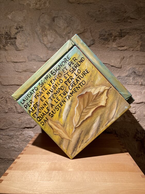 Der Titel Cubocantico ist ein Neologismus, der die Wörter „cubo“ und „cantico“ kombiniert. Der Würfel stellt die geometrische Struktur des Werks dar, während das Lied an die Poesie und Spiritualität des Liedes der Kreaturen erinnert. Das einzigartige und eindrucksvolle Werk besteht aus sechs Leinwänden, die zu einem Würfel zusammengefügt sind. Jede Leinwand stellt eines der Urelemente dar: die Sonne, den Mond, den Wind, das Wasser, das Feuer und1
