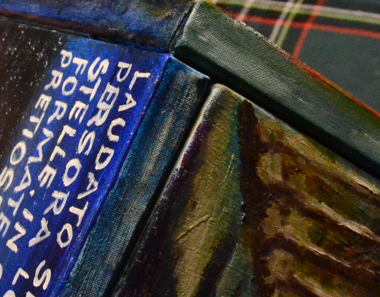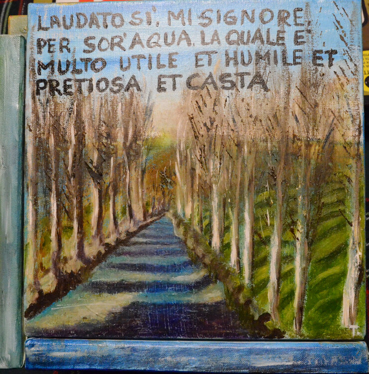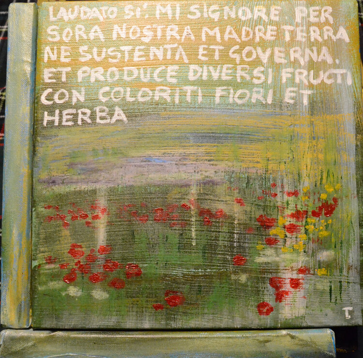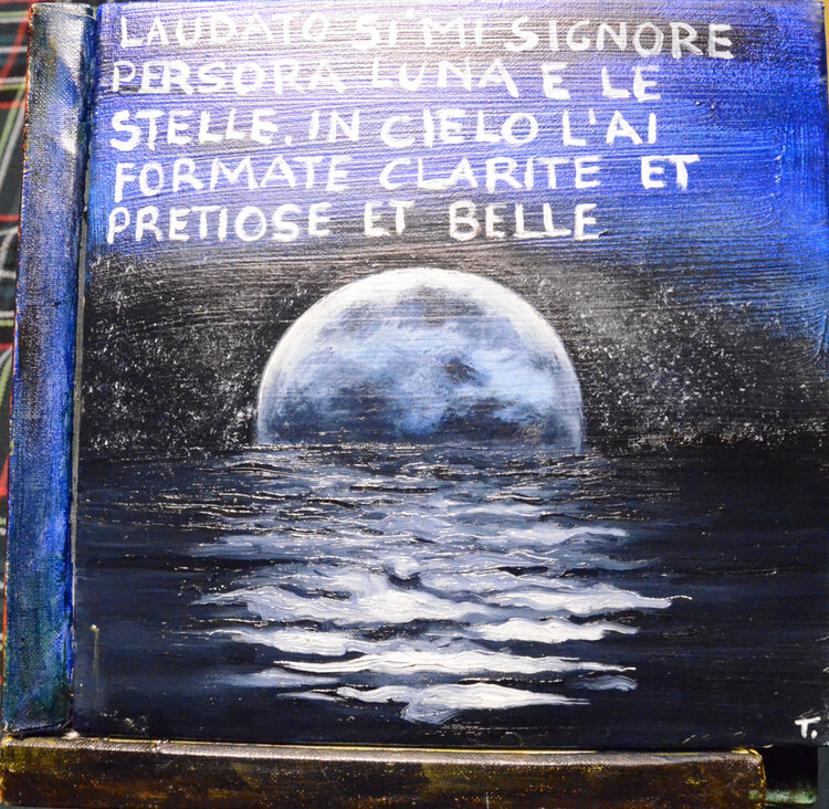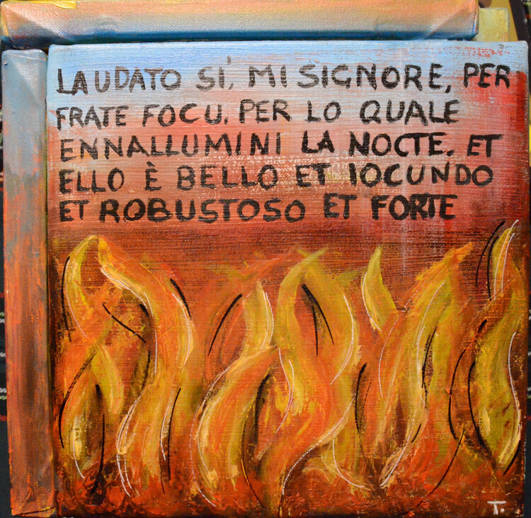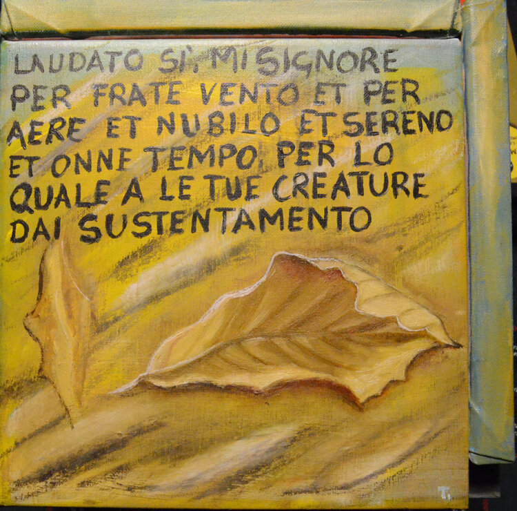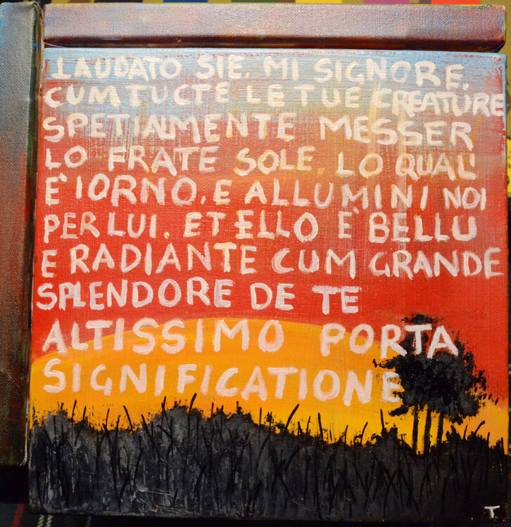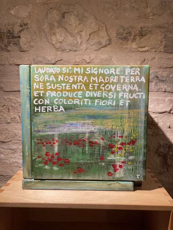 Der Titel Cubocantico ist ein Neologismus, der die Wörter „cubo“ und „cantico“ kombiniert. Der Würfel stellt die geometrische Struktur des Werks dar, während das Lied an die Poesie und Spiritualität des Liedes der Kreaturen erinnert. Das einzigartige und eindrucksvolle Werk besteht aus sechs Leinwänden, die zu einem Würfel zusammengefügt sind. Jede Leinwand stellt eines der Urelemente dar: die Sonne, den Mond, den Wind, das Wasser, das Feuer und1