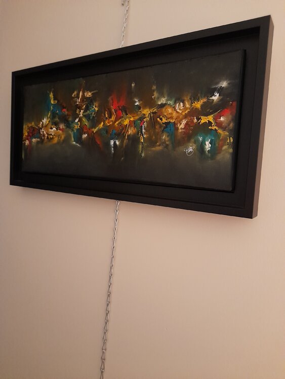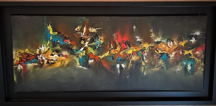 Diese Farbimplosion auf diesem 2. Bild in anderer Größe passt sehr gut zum 1., ist in einer amerikanischen Schachtel gerahmt, misst insgesamt 50,5 x 27,5 cm. Es war eine Freude, die warmen und kühlen Farben mit Messern und Pinseln in verschiedenen Formen auf diese Leinwand zu malen....