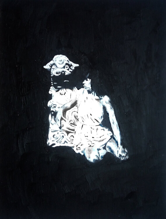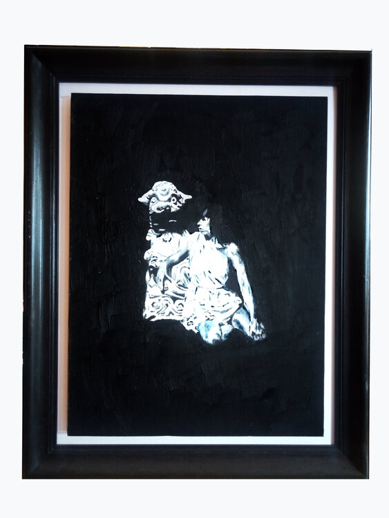 Martina vor der Schachfigur. Das Bild entstand nach einer Fotomontage ca. 1979. Die Figur des chinesischen Affen ist im Original nur 4 cm hoch. Es handelt sich um eine Schaffigur (Bauer). Die Fotomontage erfolgte mit Schere, Fotopapier und Kleber allein zum Zweck der Erstellung des Ölgemäldes.