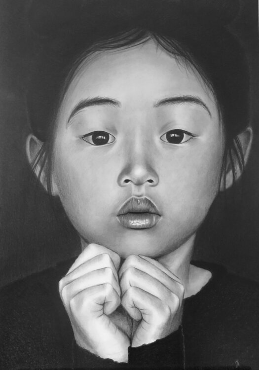 Diese A3-Zeichnung zeigt ein asiatisches Mädchen in einem schwarzen Pullover mit ihren kleinen Handflächen vorne .... sie wünscht sich, dass etwas sehr Schönes passiert.