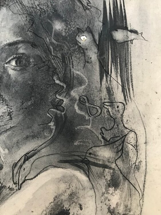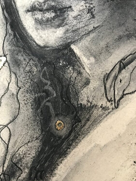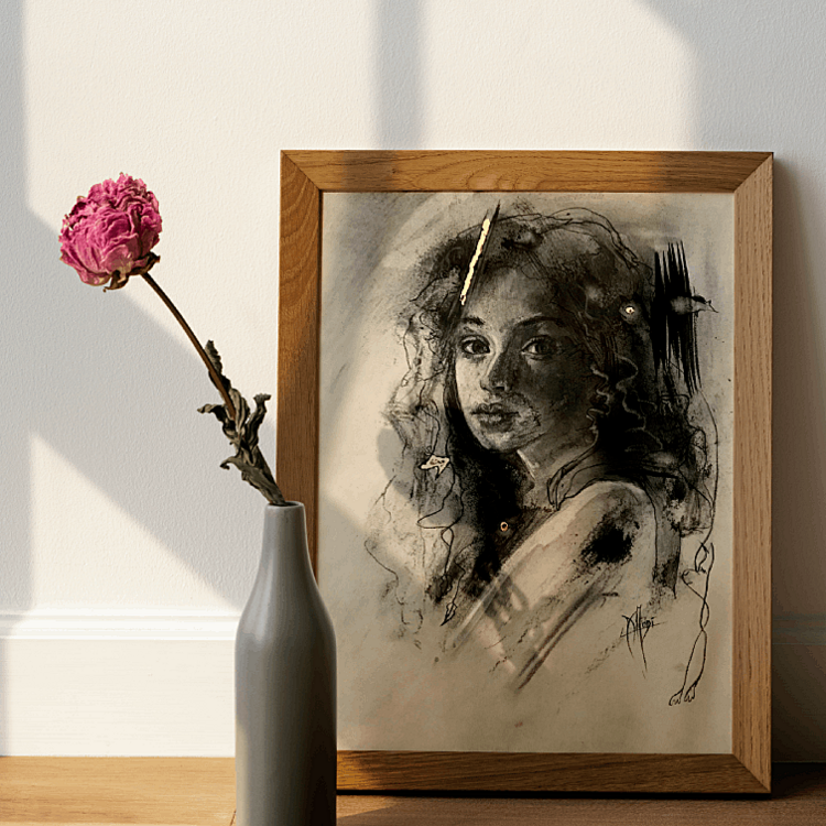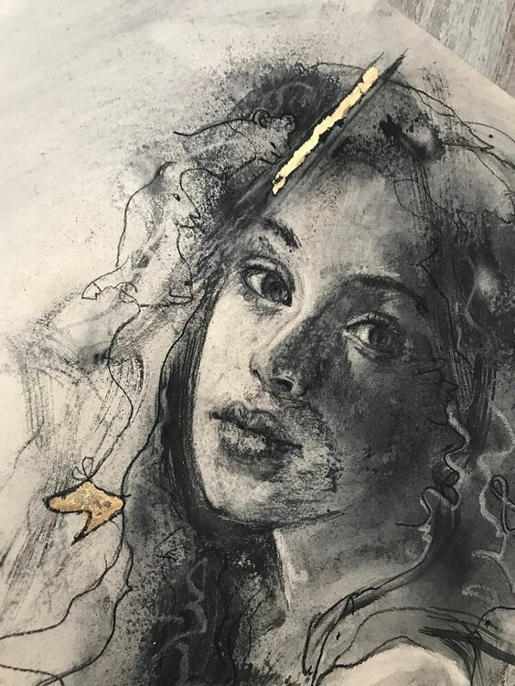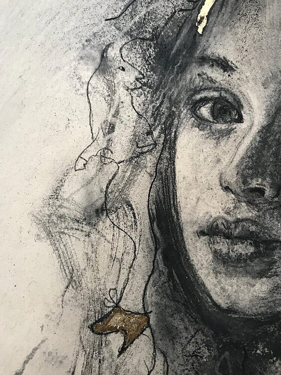 Zeitgenössisches Porträt einer jungen Frau 3/4 in Kohle und Blattgold auf 250 g Multitechnik-Papier, getönt in Naturbeige