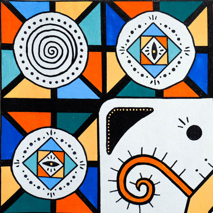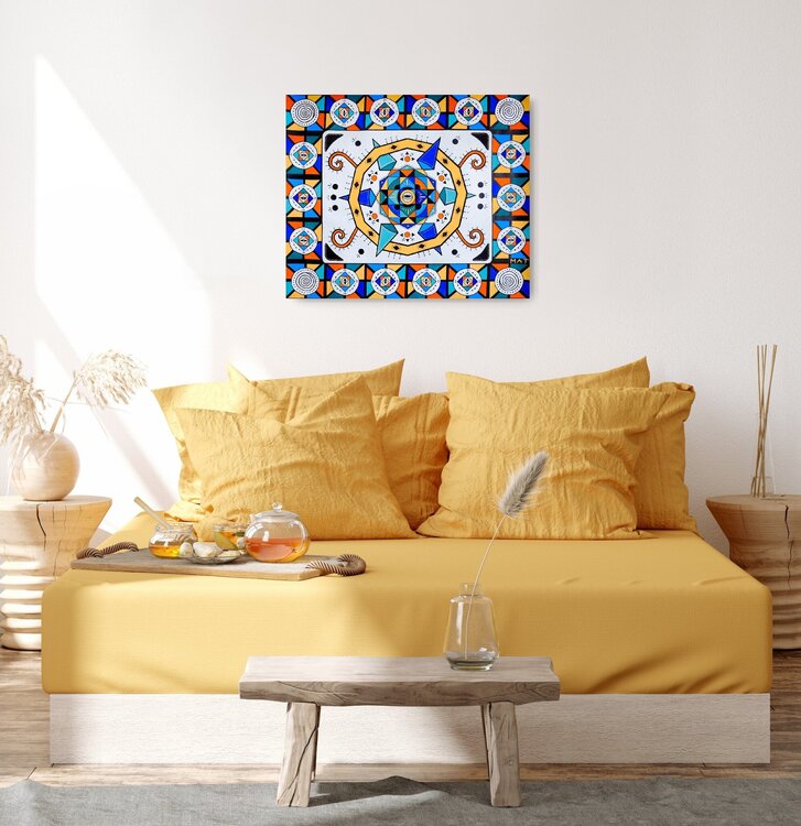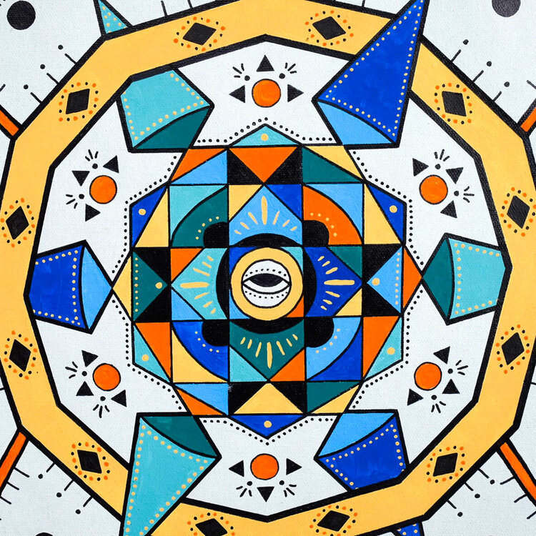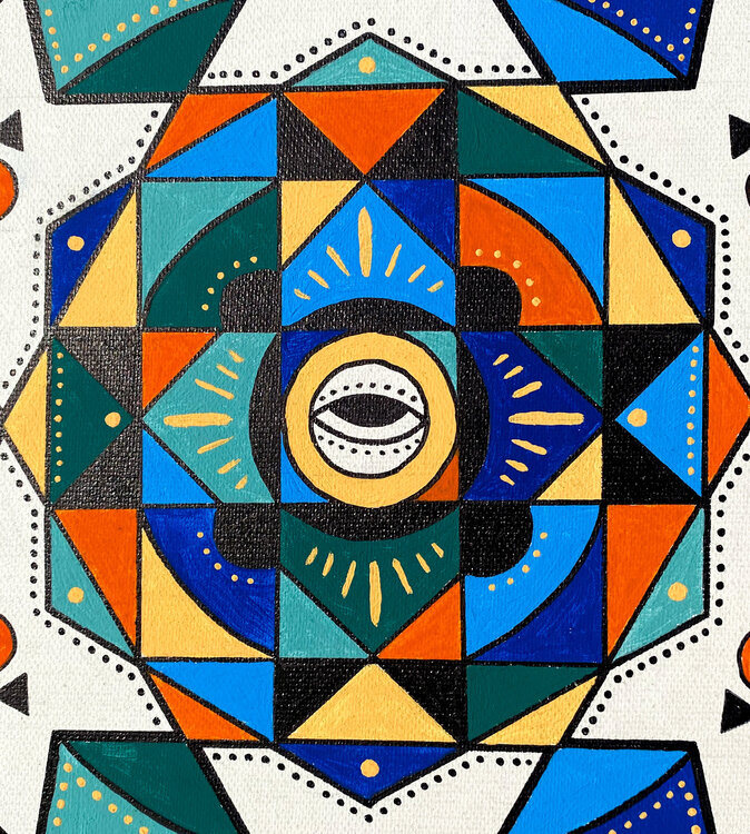 Dieses abstrakte und farbenfrohe geometrische Gemälde ist eine Einladung, unser Bewusstsein mit der dominierenden Präsenz eines schützenden Auges zu öffnen: göttlicher Energie.