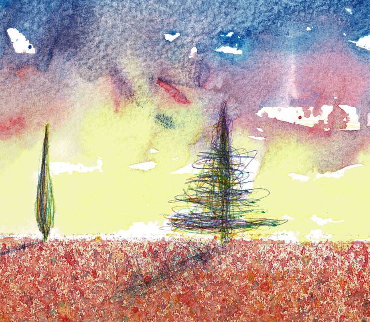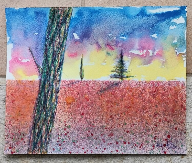 Blumenfeld mit Aquarell und Tusche auf 300-g-Papier. Versand des Aquarells mit Echtheitszertifikat und Künstlerstempel.