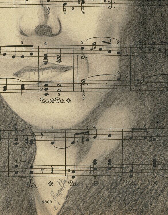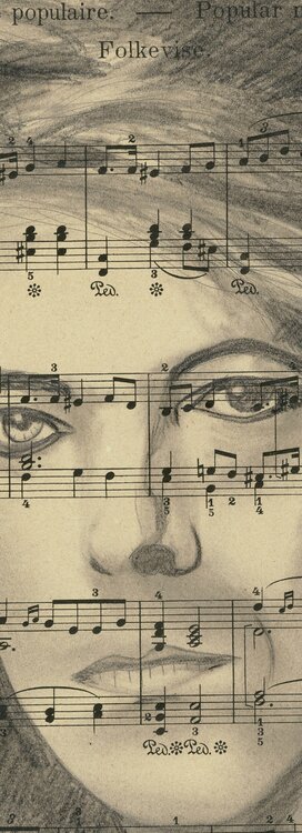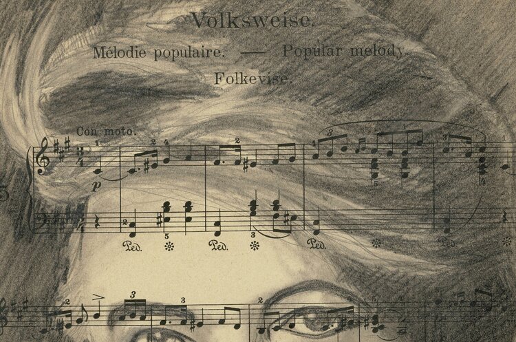 Porträt von David Bowie mit Bleistift auf einer Partitur (Lyrische Stücke) von 1922.