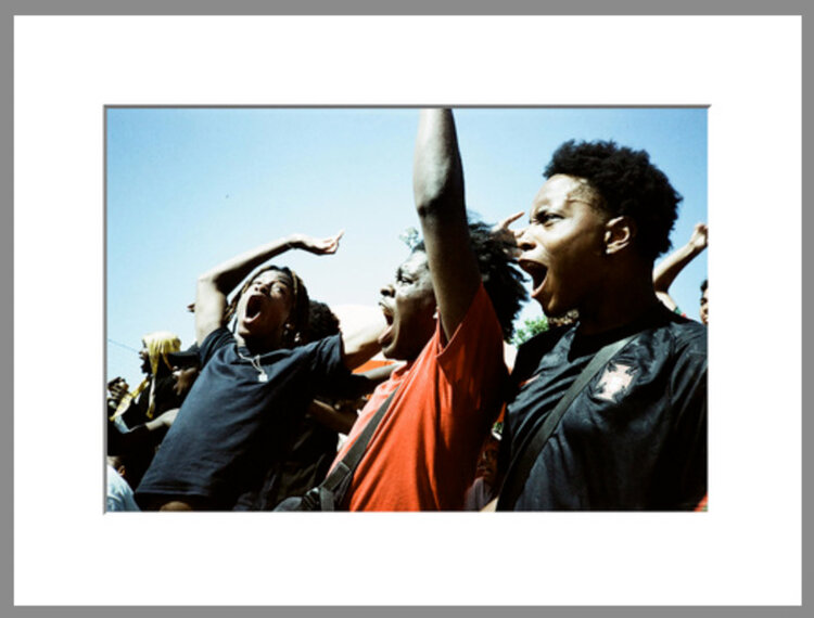 Geliefert mit einem Druck und einem Passepartout (dicker Karton mit ausgeschnittenem Fenster), alles zusammengebaut mit einer Rückseite aus Pappe, alles in einem Blisterbeutel.