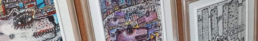 A bestiary of original animals: mad cows, mischievous cats, dogs in front of urban buildings or funny snails.