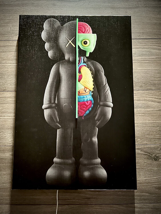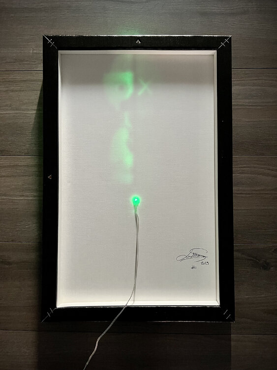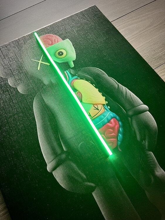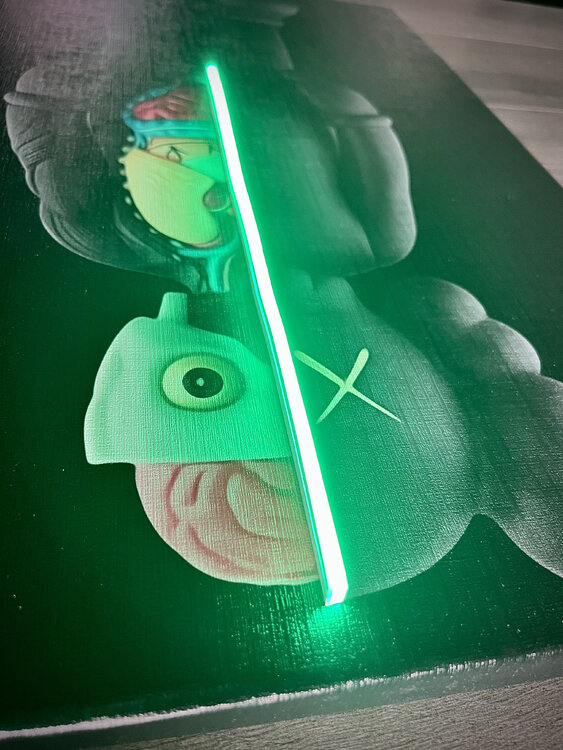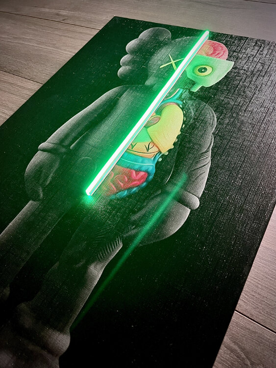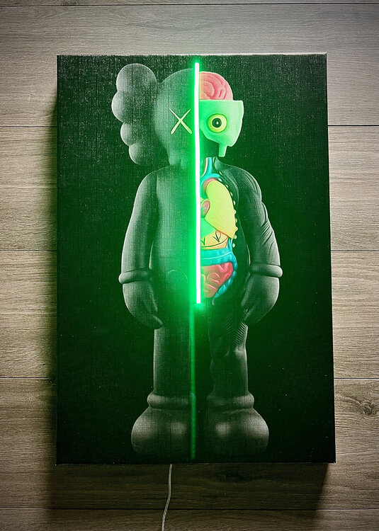High quality and long-lasting 12v Neon effect Led. Glossy, protective and scratch-resistant resin coating on the front. Canvas with 1 cm wooden support on the back to hang the work. Including 2m transparent1