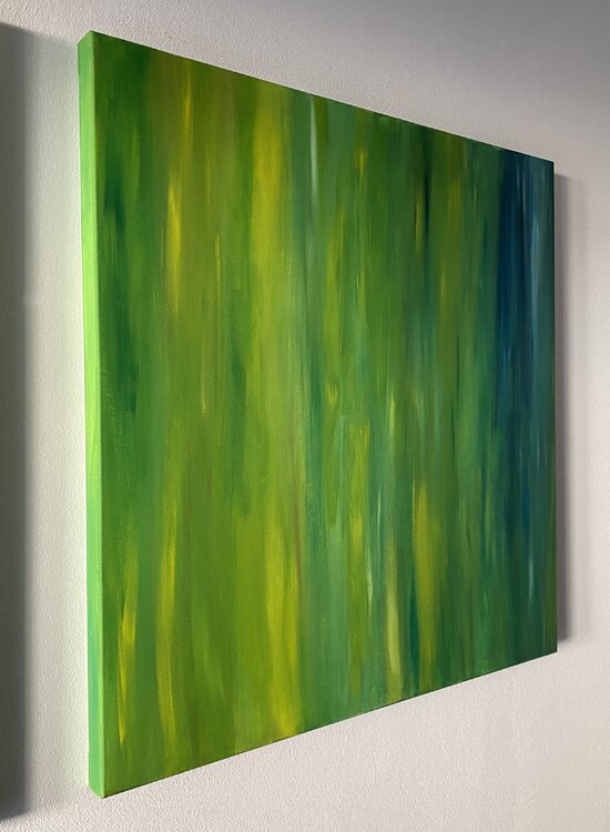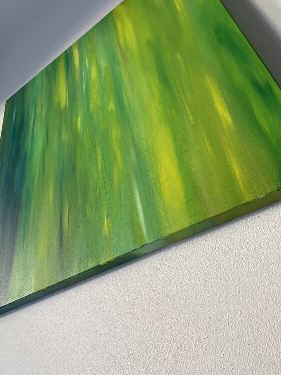 This abstract artwork aims to tell about the magic feeling that the artist live when is walking surrounded by nature. When she close the eyes she can feel to be one thing with the nature. The composition is very simple in order to let the spotlight to the colors. The various shadows were created using only the primary colors. Medium: acrilics.