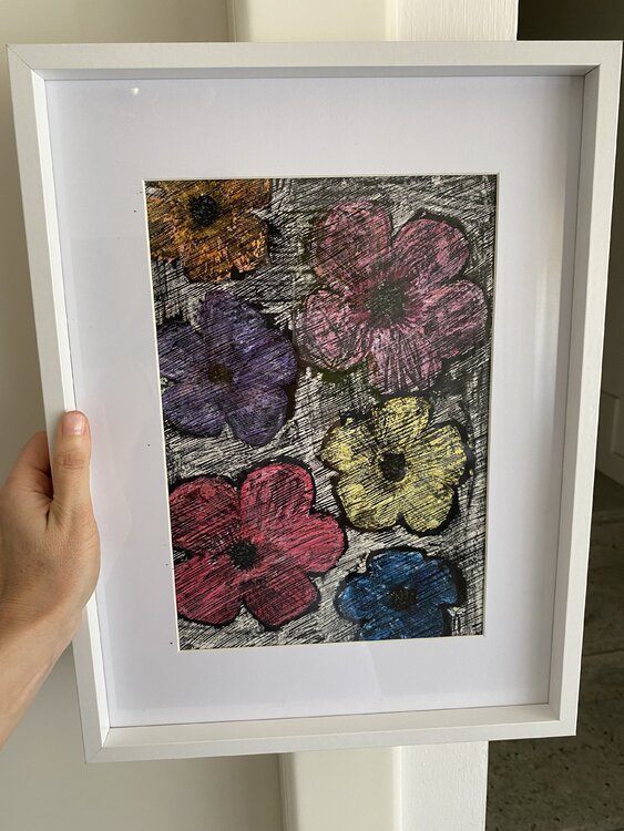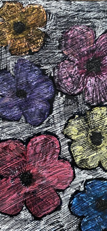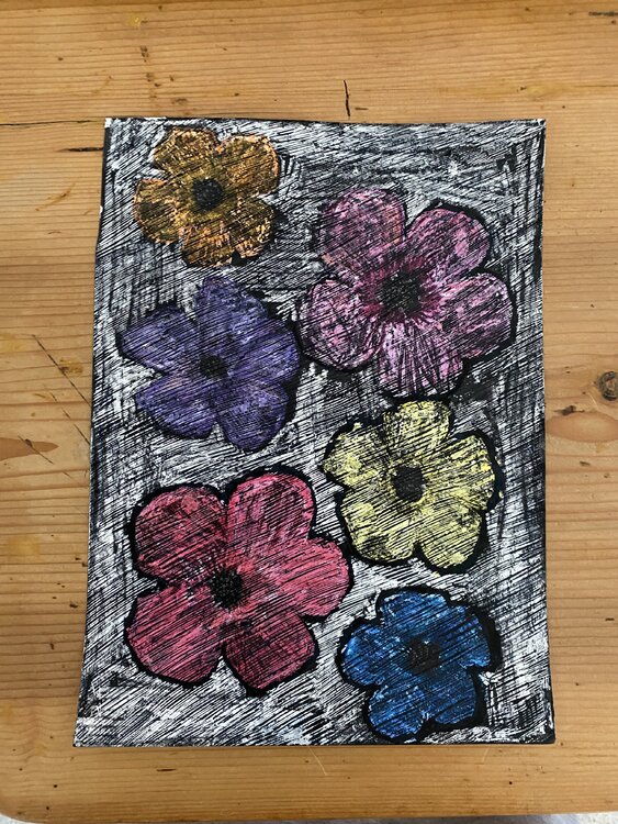 The artwork was created by overlaying various layers of colors with waxl pastels. Everything was then covered with a last black ink.Then with a tool, it was scratched until the drawing was obtained.