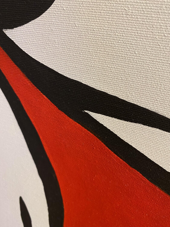 Very simple concept that is underline by th very simple line of the drawing. Few strong colors are the other peculiarity of this artwork: Dark Grey , white and clear red. "Tha't all folks "
